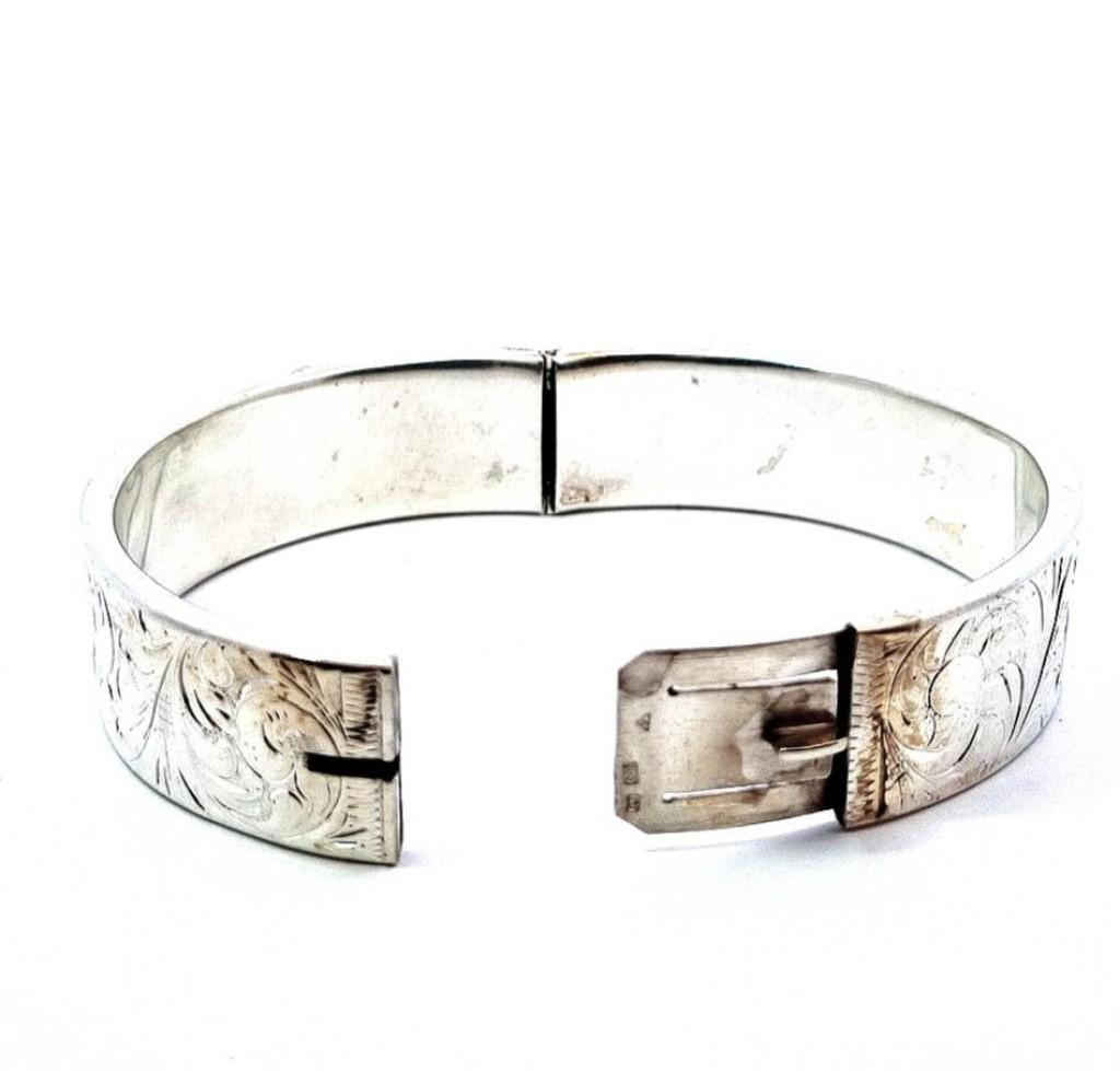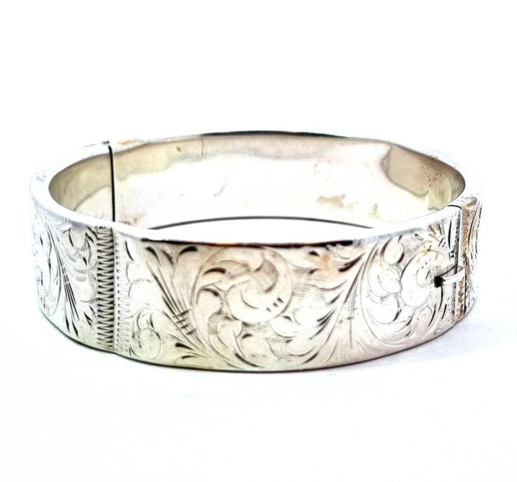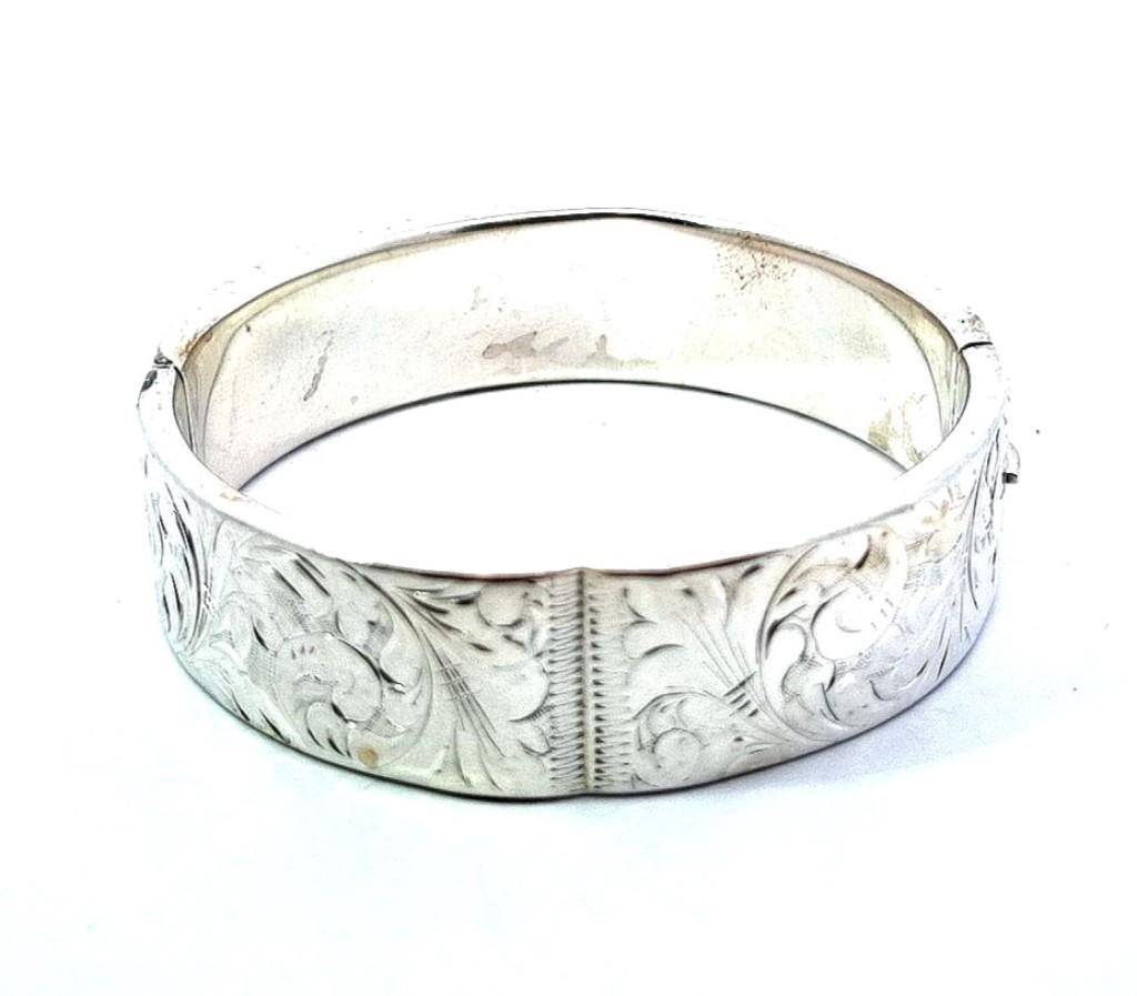 Stříbrný náramek o ryzosti 900/1000, platná puncovní značka. Váha 34,42 g, vnitřní průměr 62 mm, šířka 18 mm.