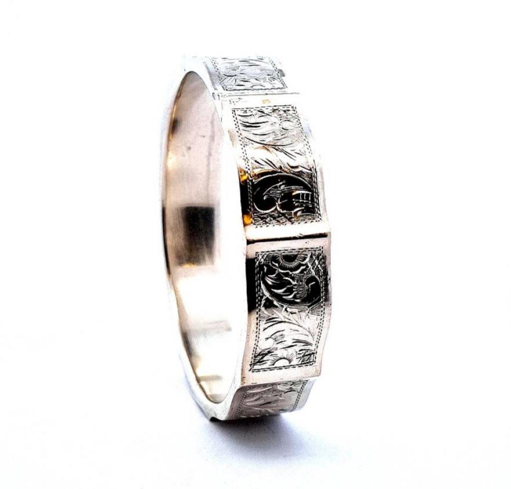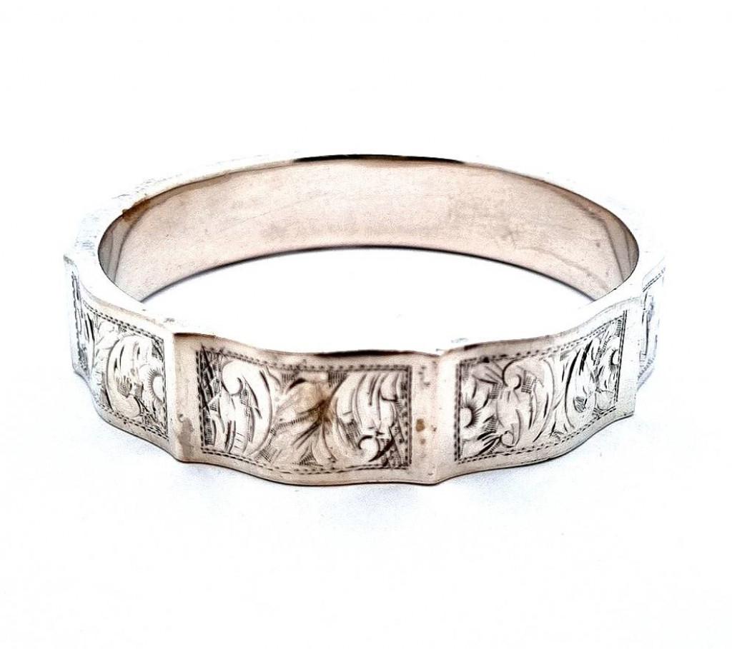 Stříbrný náramek o ryzosti 800/1000, platný punc. Váha 39,30 g, vnitřní průměr 66 mm, v nejširším bodě 16 mm.