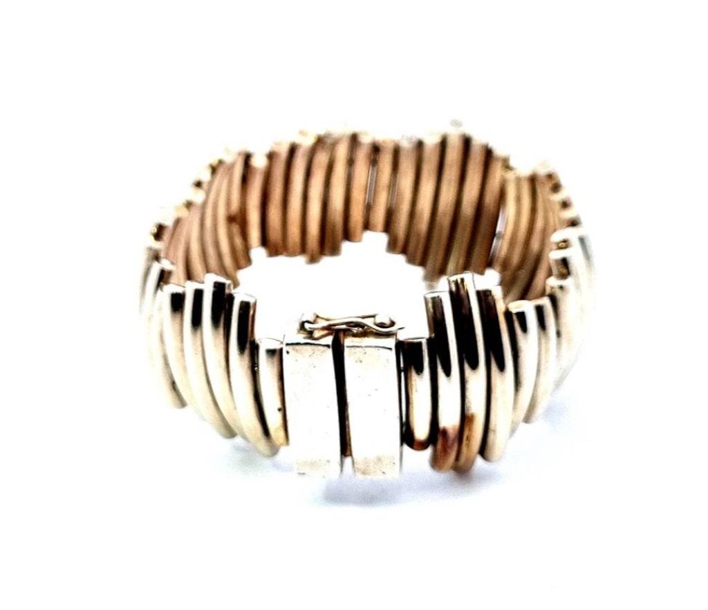 Stříbrný náramek o ryzosti 925/1000, punc kamzík. Váha 57,92 g, délka 17,4 cm, v nejširším bodě 28,5 mm.