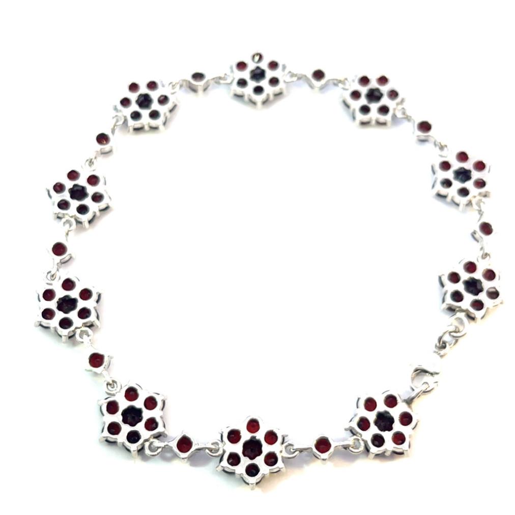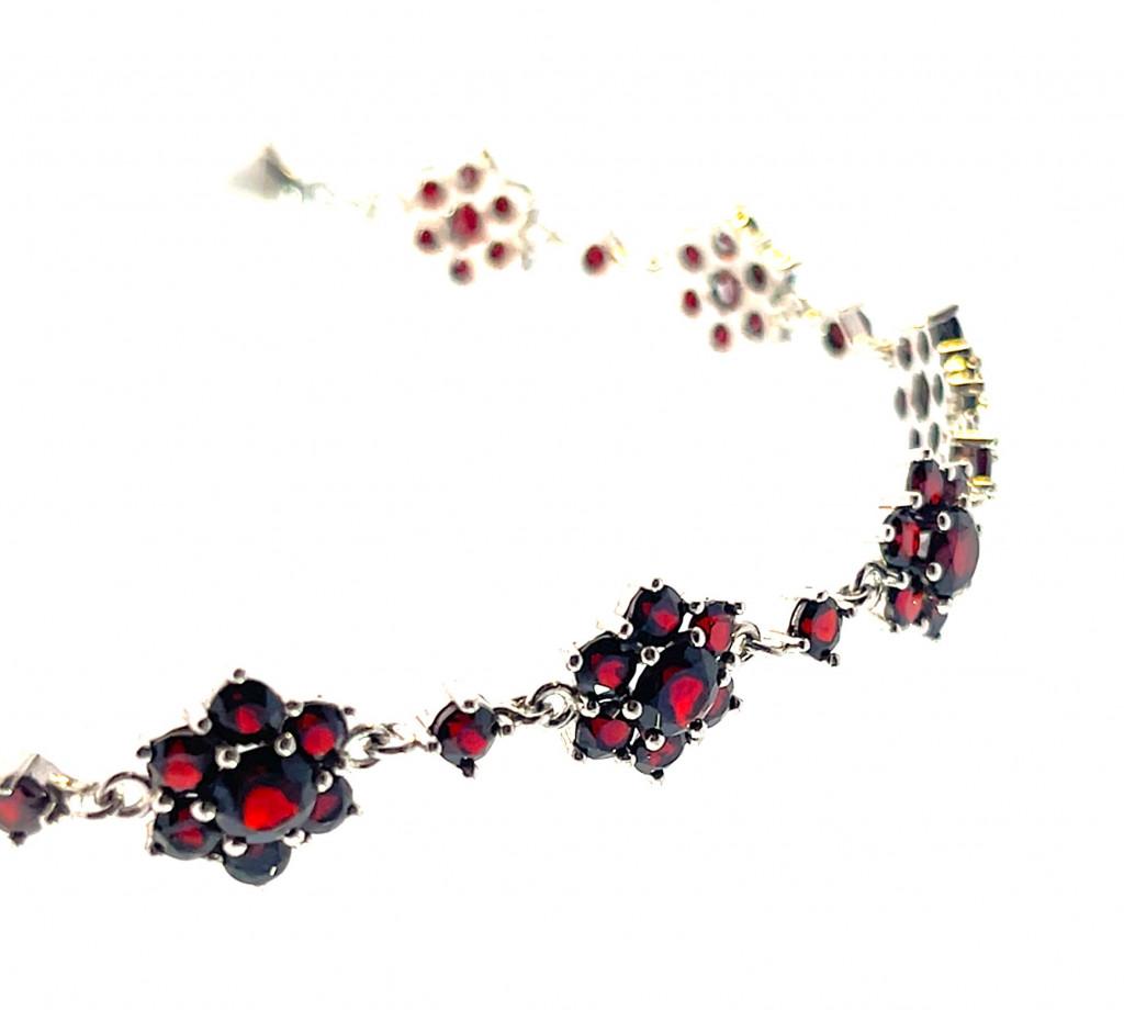 Krásný náramek ze stříbra o ryzosti 925/1000 s puncem kamzík. Náramek je zdoben českými granáty vsazenými do tvaru květinek. Granáty značeny G. Délka náramku je 20 cm. Váha 10,11 g. Průměr ozdob je 10 mm. Průměr největších granátů je 4,5 mm. Kameny jsou přírodní granáty.