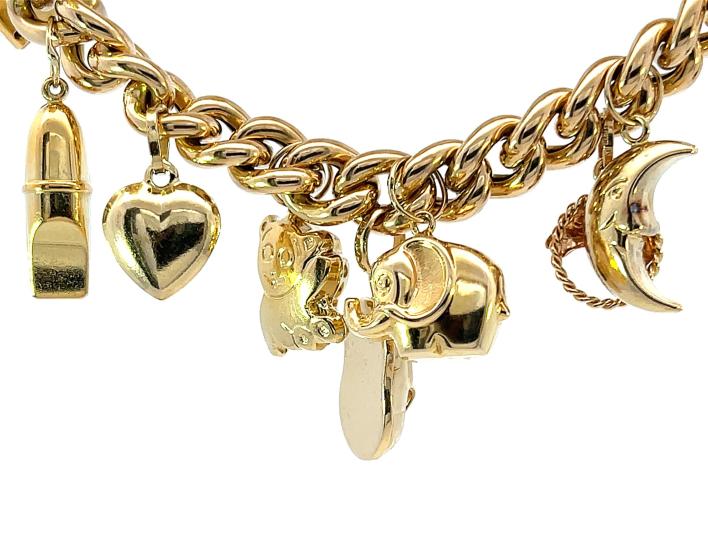 Zlatý náramek z kombinace zlata o ryzosti 750/1000 (2 přívěsy), 585/1000 (většina náramku), 540/1000 (3 závěsné kroužky) 333/1000 (3 přívěsy) punc kohout, labuť, Z a slunce. Váha 35,16 g, délka 19,5 cm, v nejširším bodě náramek 9 mm.