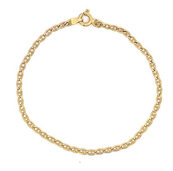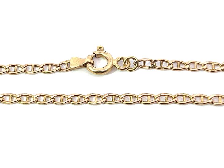 Náramek z růžoévho zlata o ryzosti 585/1000, punc labuť. Váha 1,15 g, délka 18 cm, v nejširším bodě 2 mm.