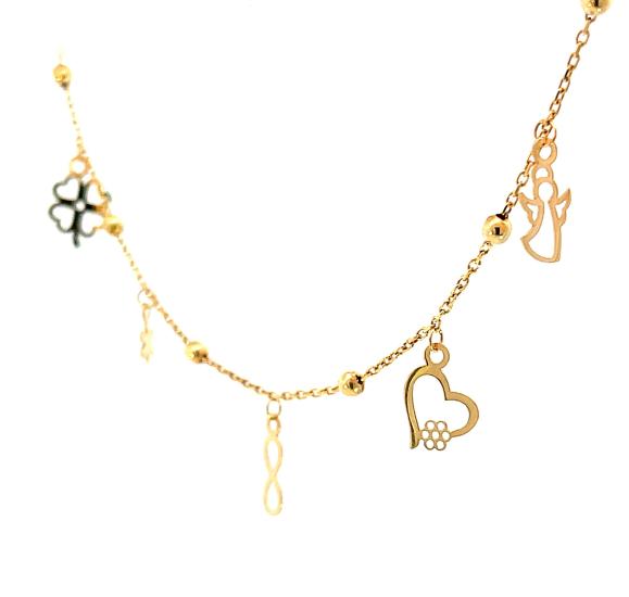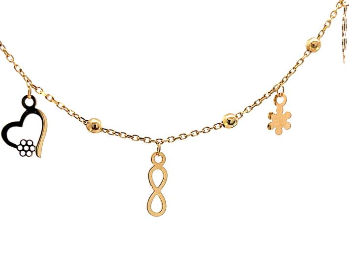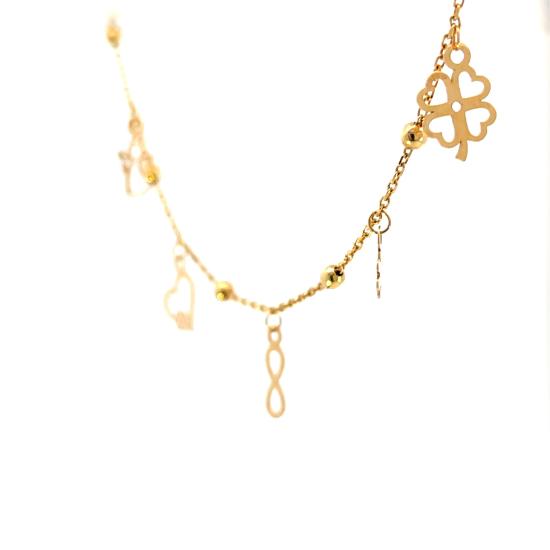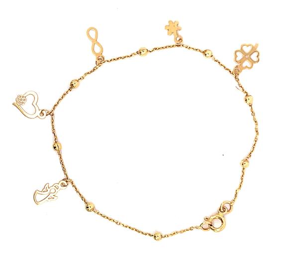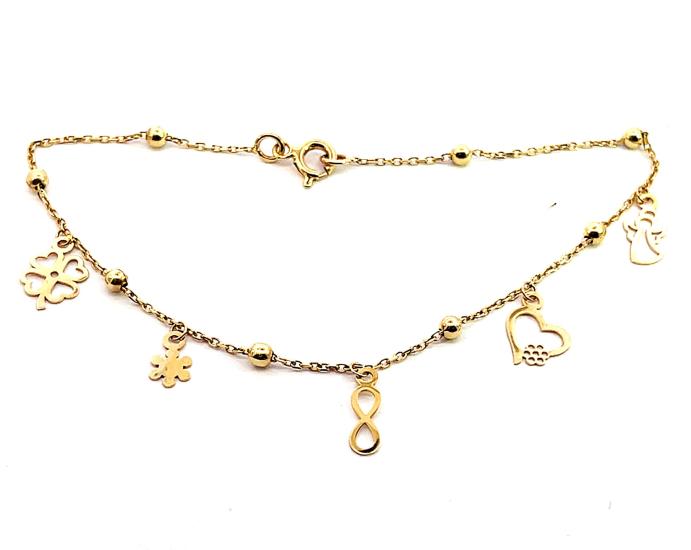 Zlatý náramek s přívěšky, ryzost 585/1000 s puncem labuť. Váha 1,42 g, délka 18 cm. Průměr kuliček je 2,5 mm. Rozměry čtyřlístku jsou 6 x 10 mm.