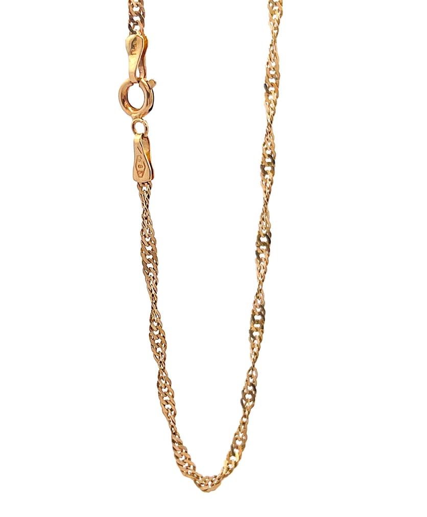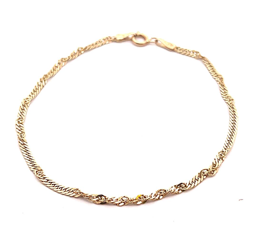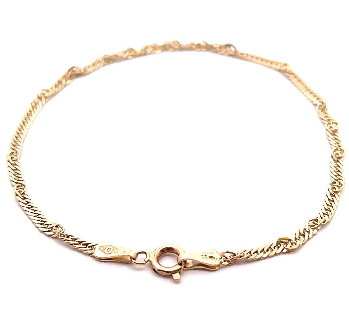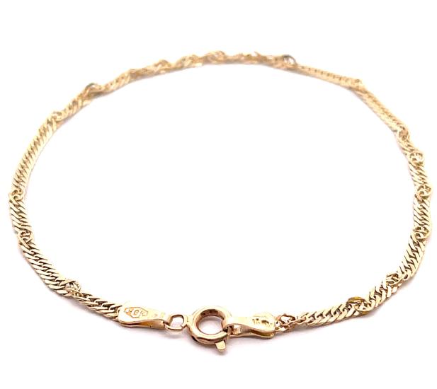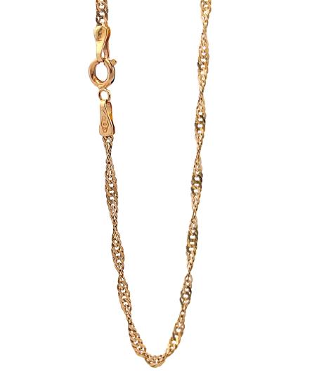 Zlatý náramek typu singapur o ryzosti 585/1000, punc labuť. Váha je 1,76 g, délka 19 cm, šířka 2 mm.