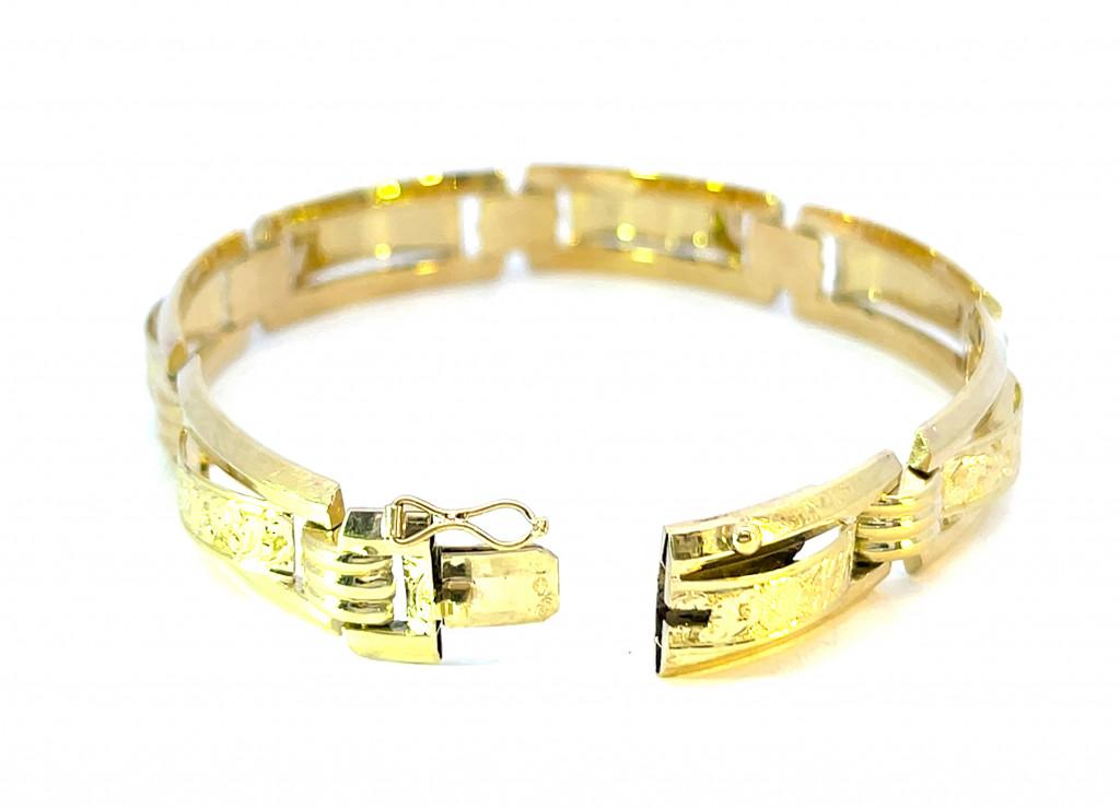 Zlatý náramek o ryzosti 585/1000, punc lvíček. Váha 15,09 g, délka 18,8 cm, v nejširším bodě 11 mm.