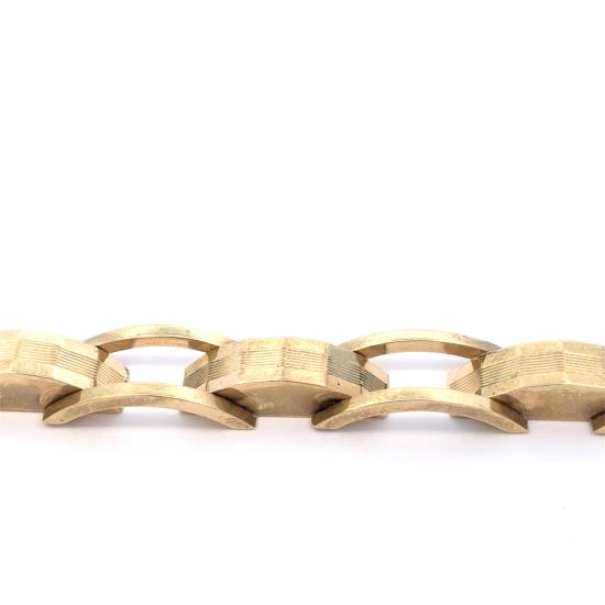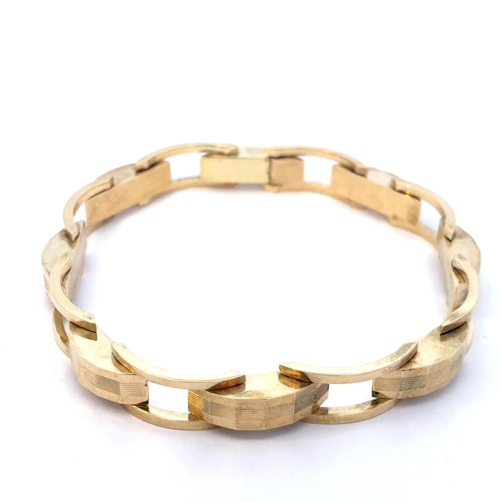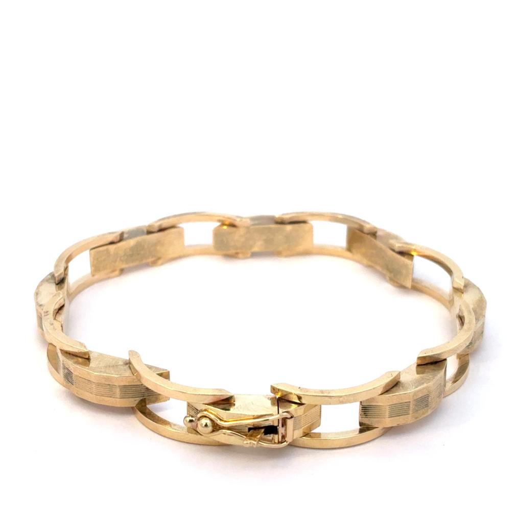Zlatý náramek o ryzosti 585/1000, punc lvíček. Váha 14,20 g, délka 18,8 cm, v nejširším bodě 8 mm.