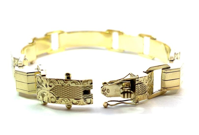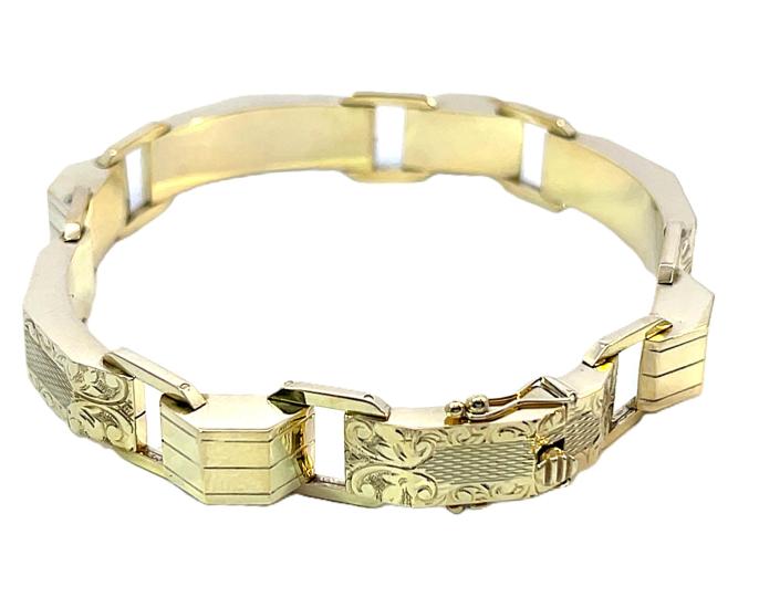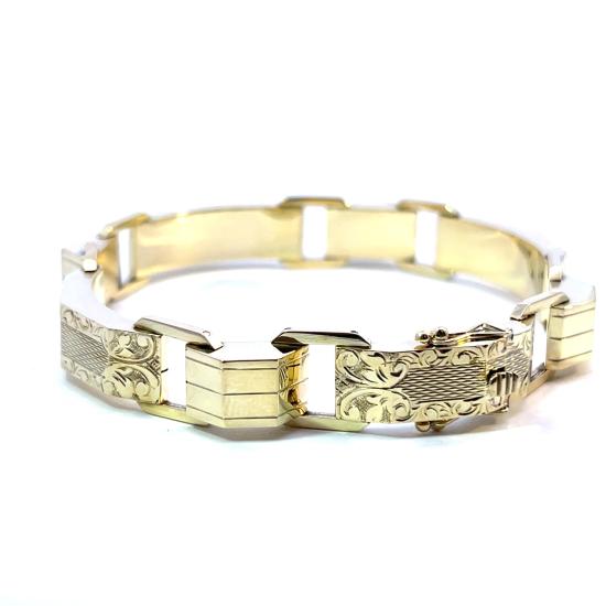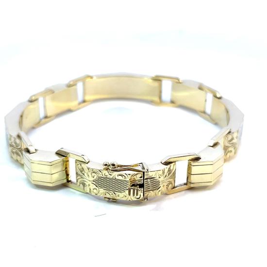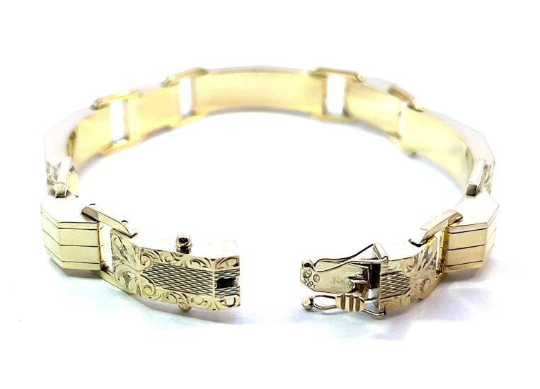Zlatý náramek o ryzosti 585/1000, punc lvíček. Váha 15,15 g, délka 18,5 cm, v nejširším bodě 11 mm.