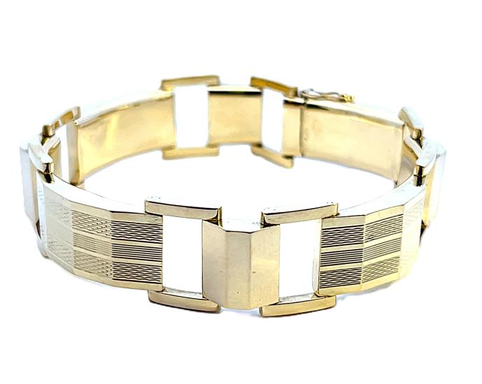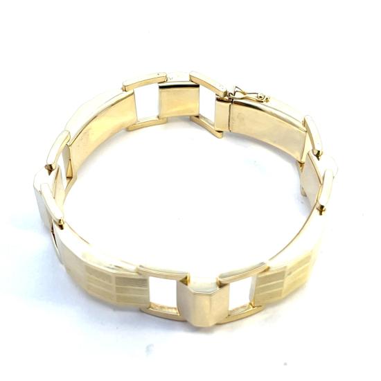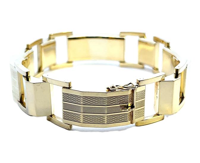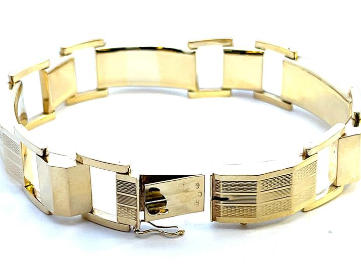 Zlatý náramek o ryzosti 585/1000, punc lvíček. Váha 23,18 g, délka 18,5 cm, v nejširším bodě 16 mm.