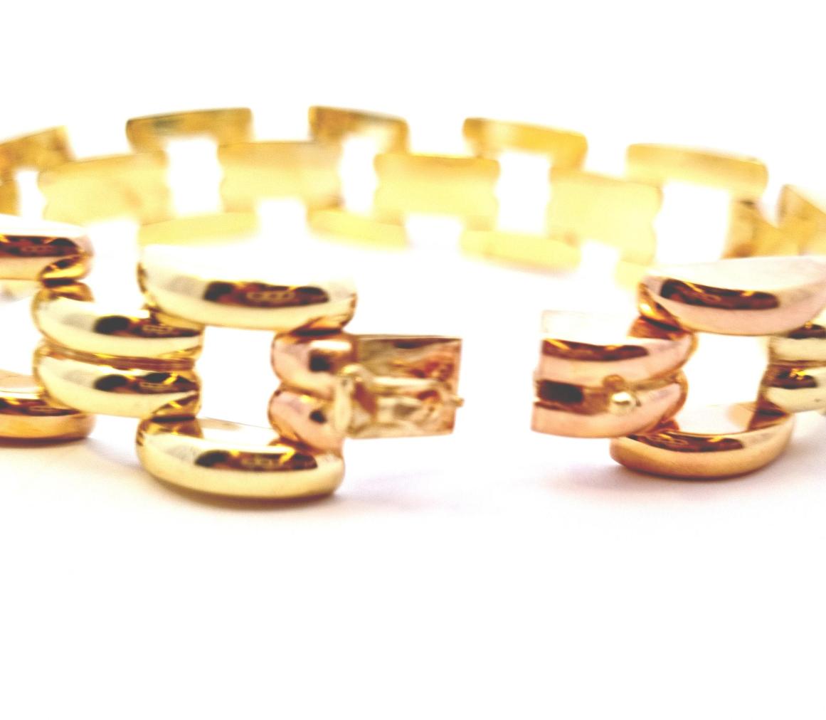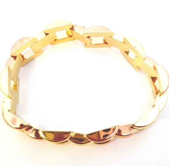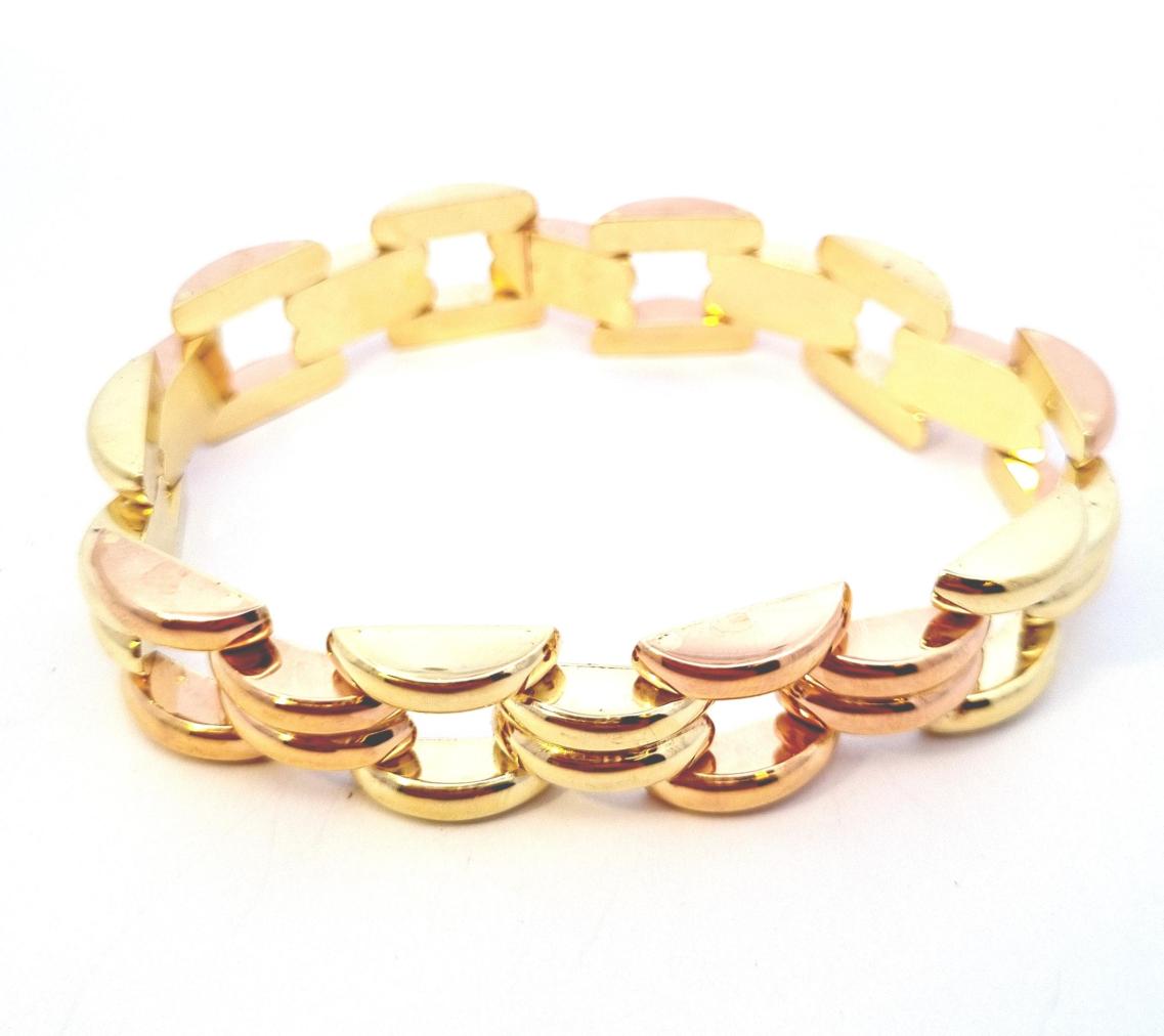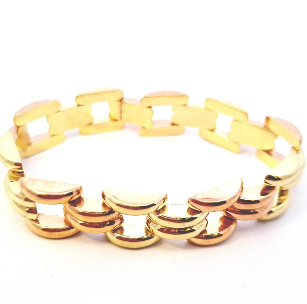 Náramek z kombinace žlutého a růžového zlata o ryzosti 585/1000, punc lvíček. Váha 31,49 g, délka 19,7 cm, v nejširším bodě 14,5 mm. Ze zadní strany má zlato pár velmi drobných oťuků.
