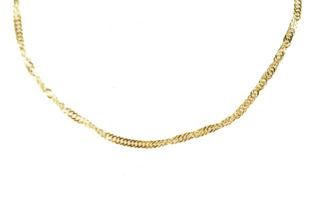 Zlatý náramek o ryzosti 585/1000, punc labuť. Váha 1,20 g, délka 19,5 cm, šířka 2 mm.