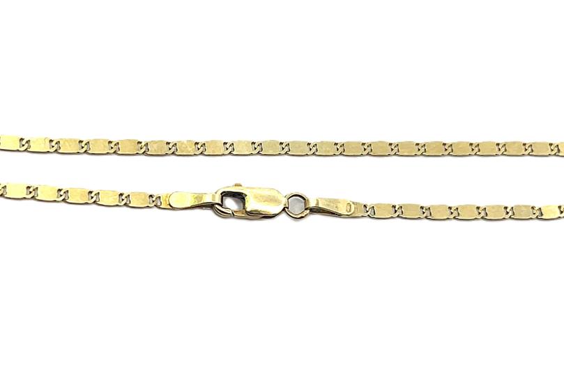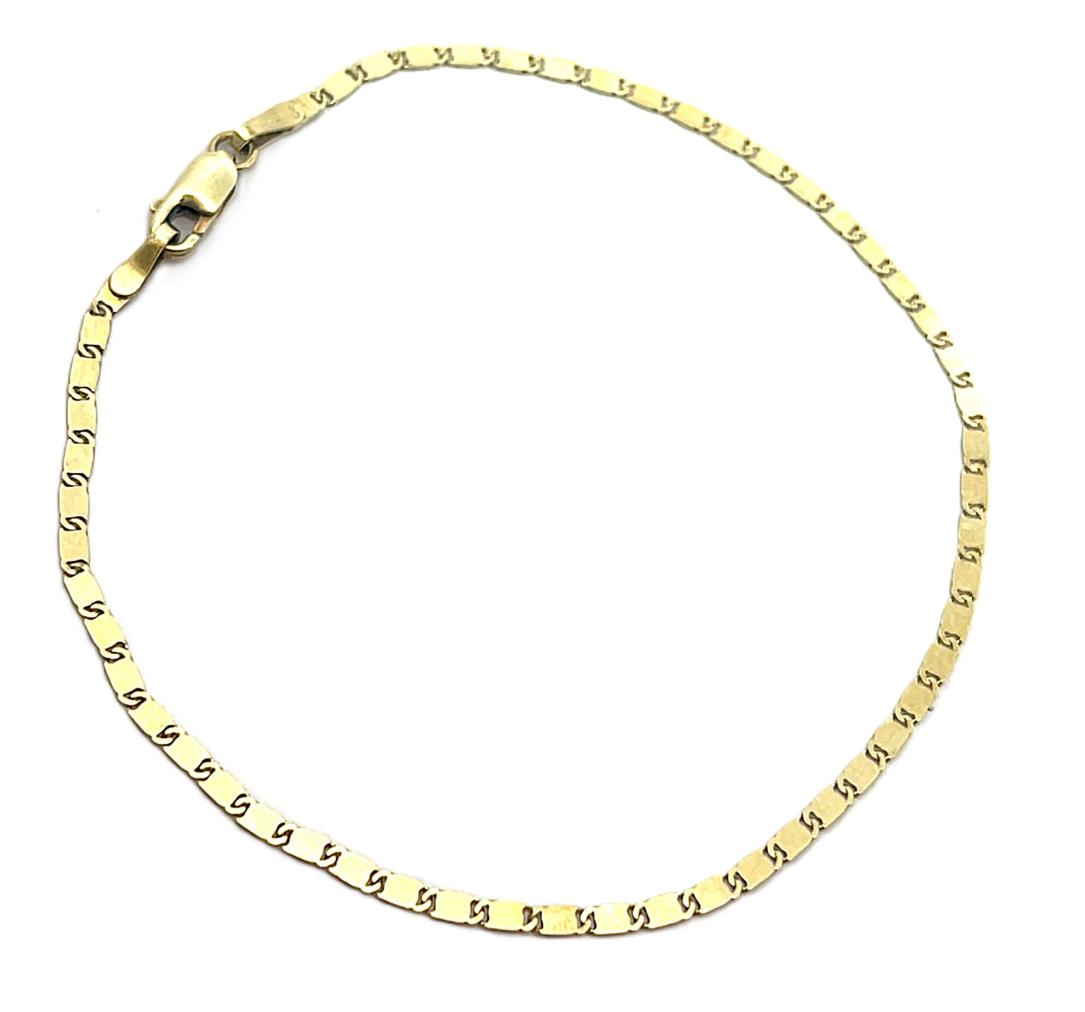 Zlatý náramek o ryzosti 585/1000, punc labuť. Váha 1,59 g, délka 18,2 cm, v nejširším bodě 2 mm. Jeden článěk je velmi lehce vychýlený, okem skoro nepatrná chyba.