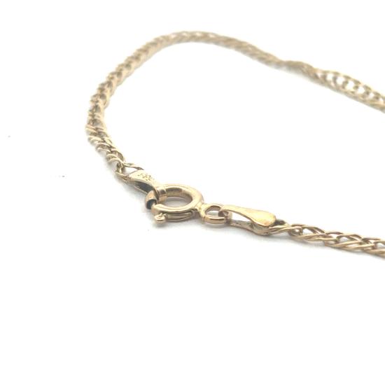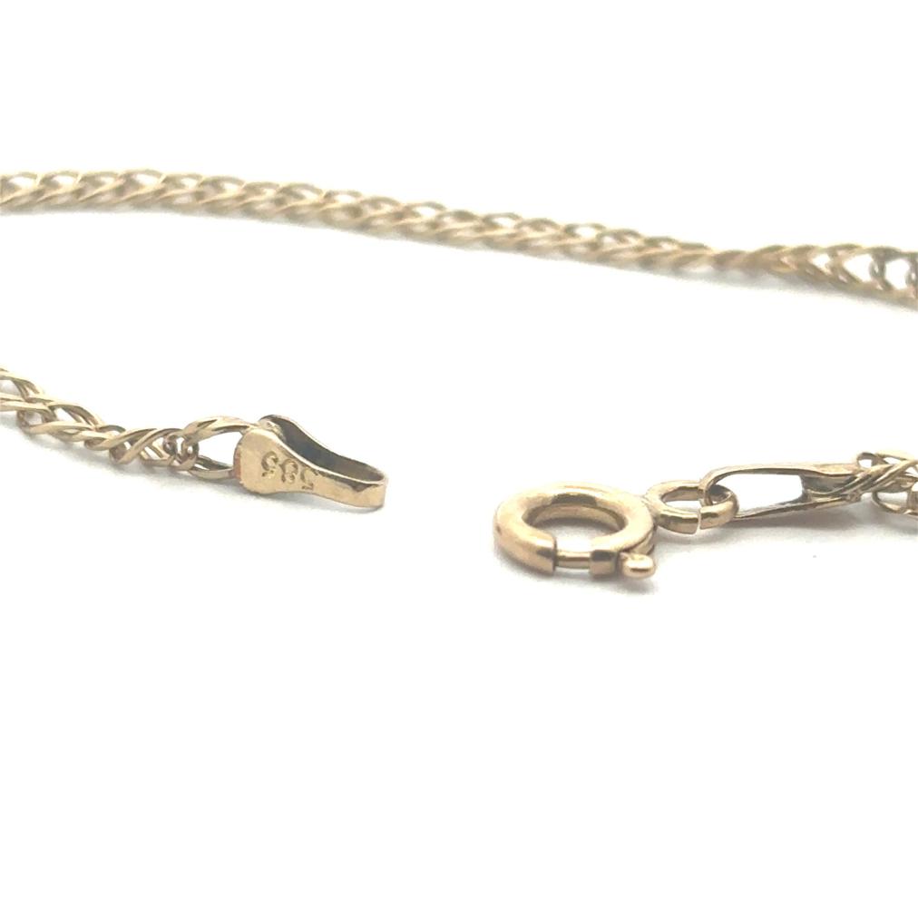 Zlatý náramek o ryzosti 585/1000, punc labuť. Váha 1,62 g, délka 19 cm, v nejširším bodě 2,5 mm.