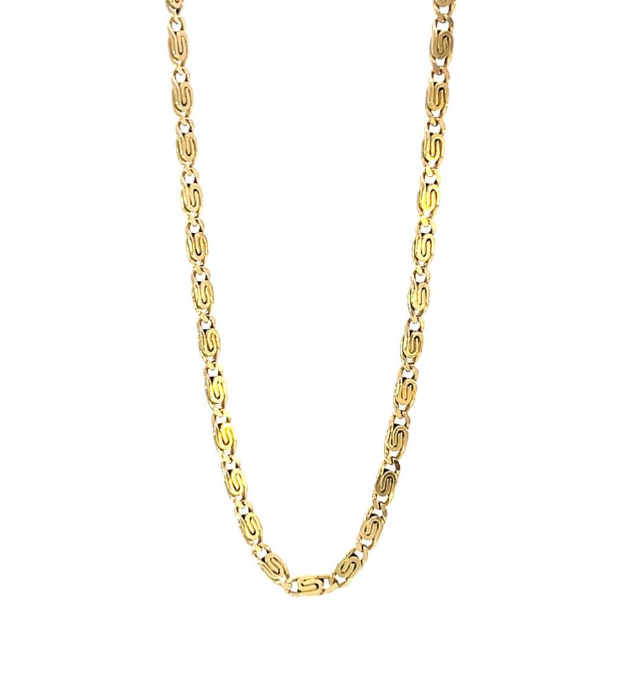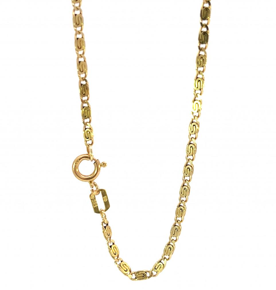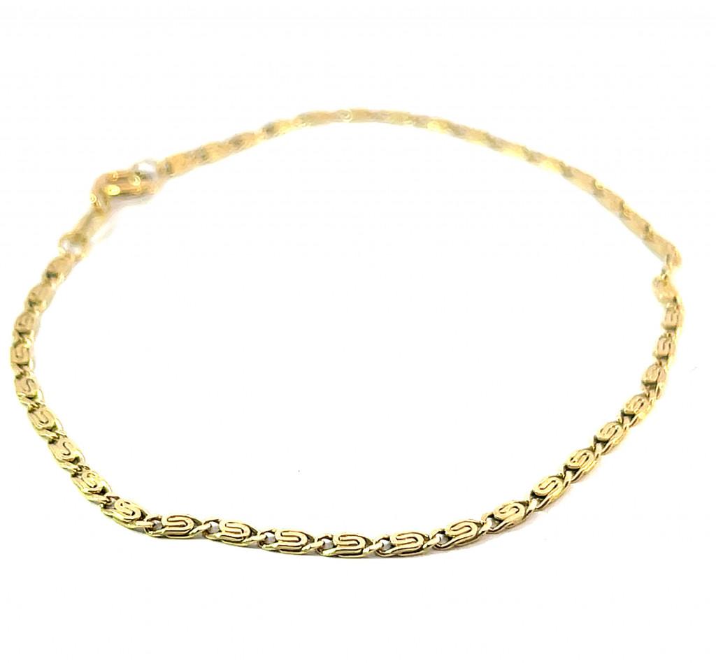 Zlatý náramek o ryzosti 585/1000, punc labuť. Váha 2,38 g, délka 18,5 cm, v nejširším bodě 2 mm.