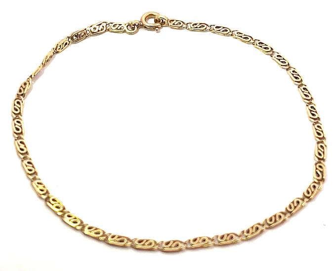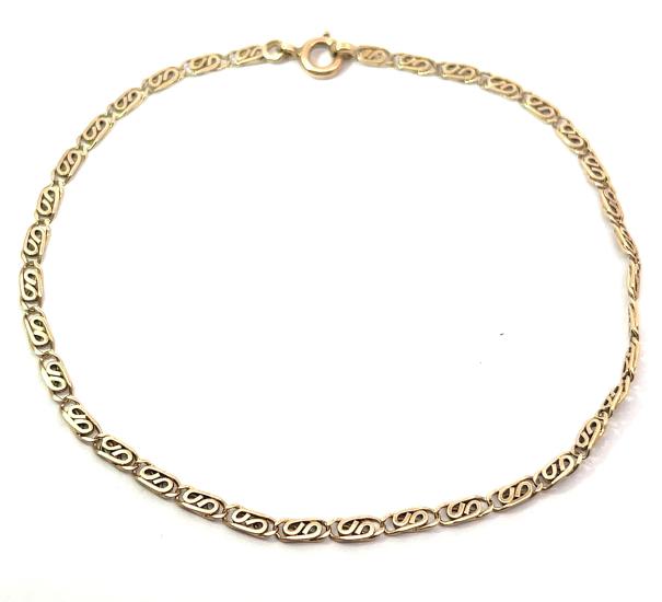 Zlatý náramek o ryzosti 585/1000, punc čejka. Váha 2,63 g, délka 20,5 cm, v nejširším bodě 2,5 mm.