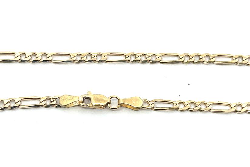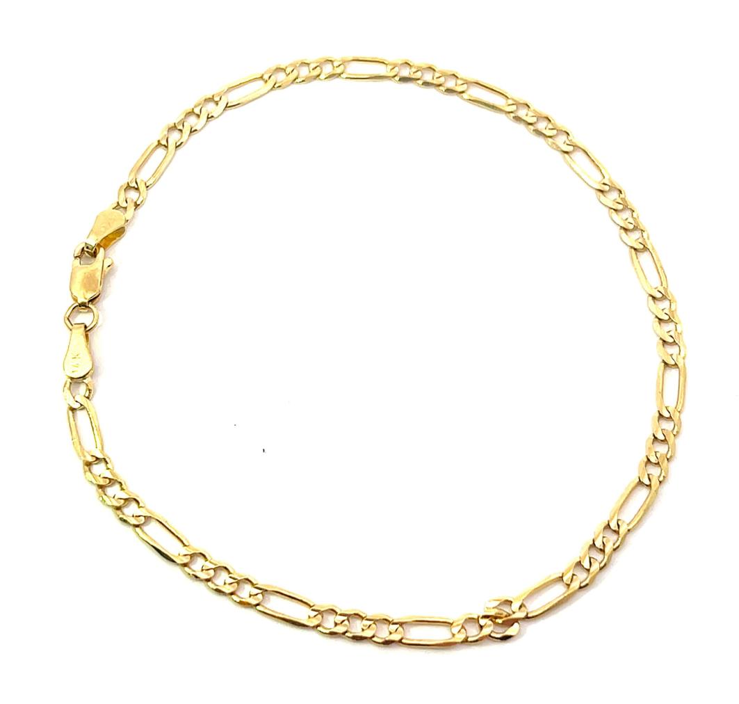 Zlatý náramek o ryzosti 585/1000, punc labuť. Váha 3,41 g, délka 20,2 cm, v nejširším bodě 3 mm.