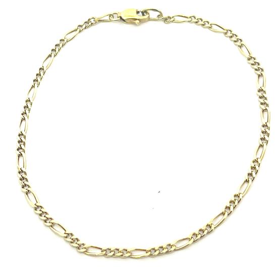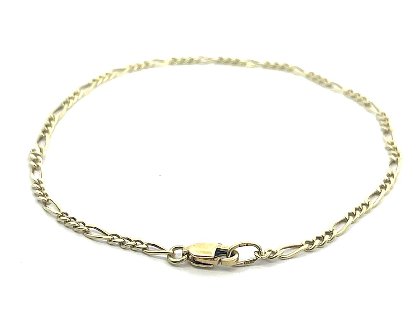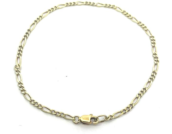 Zlatý náramek o ryzosti 585/1000, punc labuť. Váha 2,69 g, délka 19,5 cm, v nejširším bodě 2 mm.