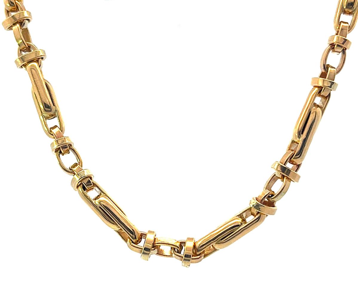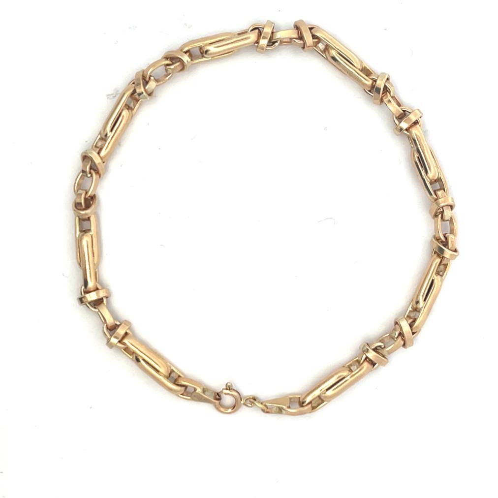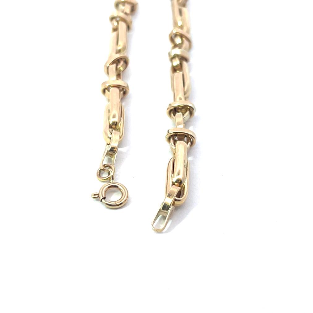 Zlatý náramek o ryzosti 585/1000, punc labuť. Váha 20,34 g, délka 23,2 cm, v nejširším bodě 7 mm.