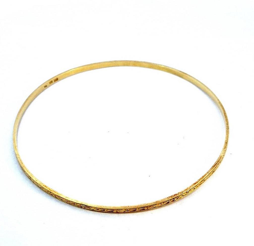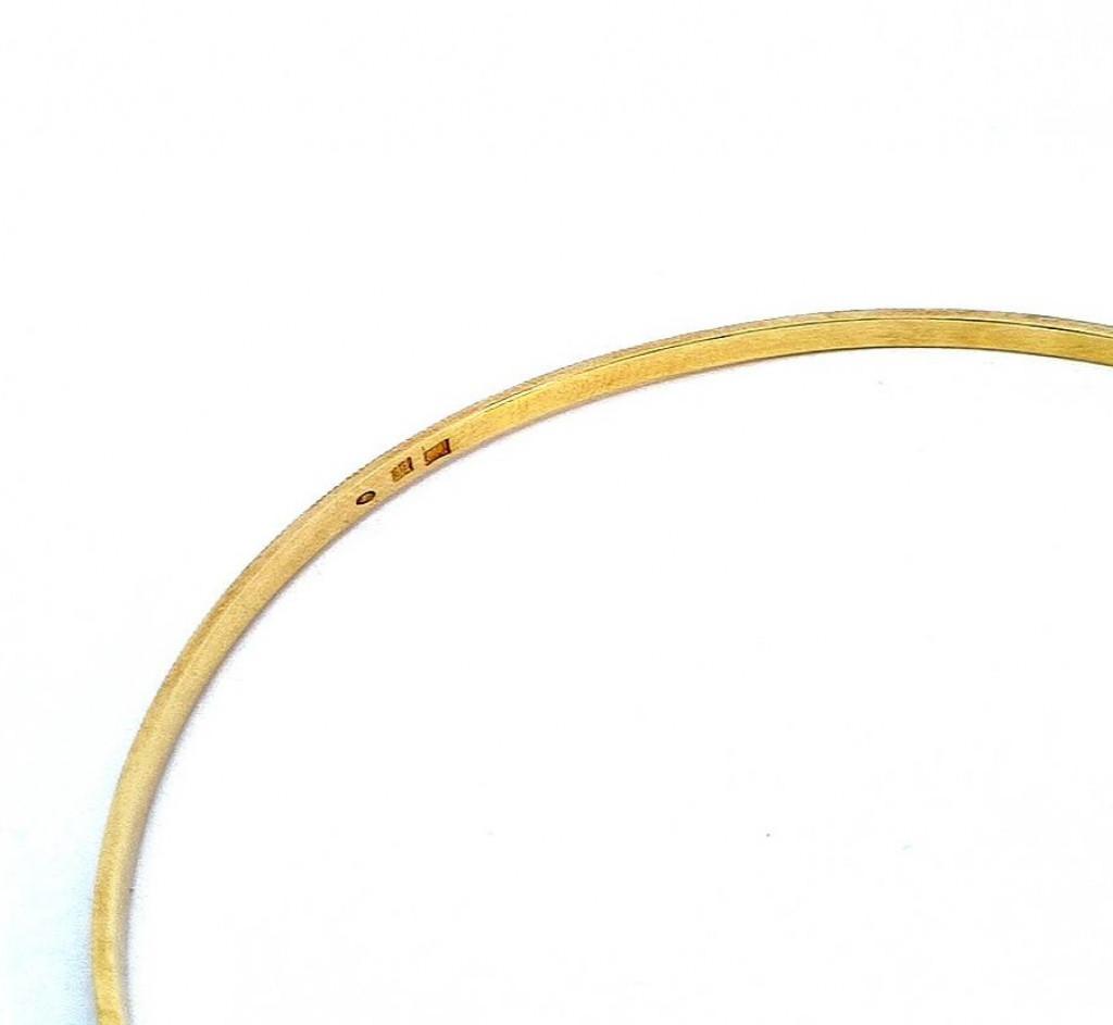 Zlatý náramek o ryzosti 585/1000, punc čejka. Váha 6,07 g, vnitřní průměr 67 mm, v nejširším bodě 2 mm.