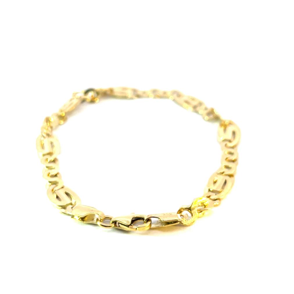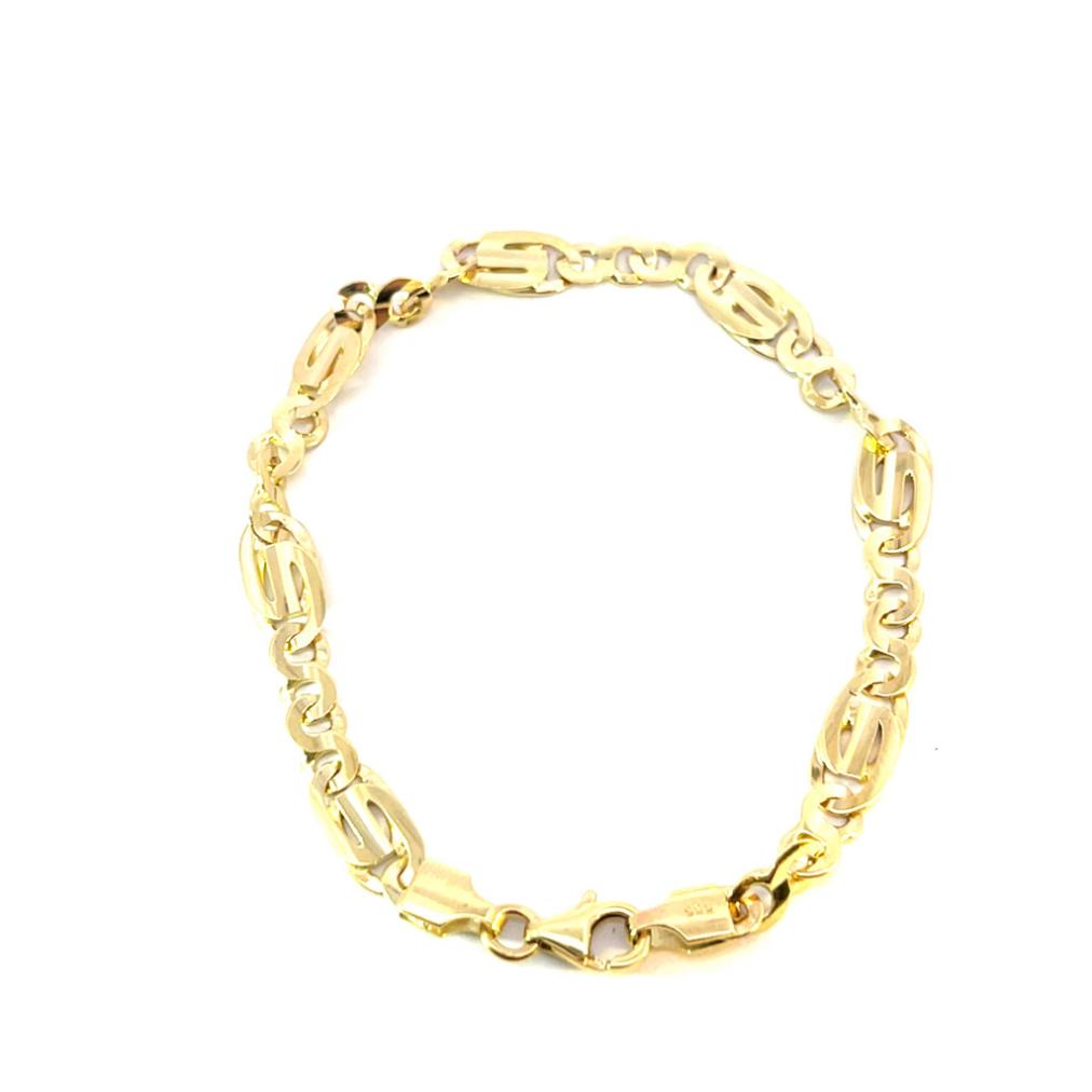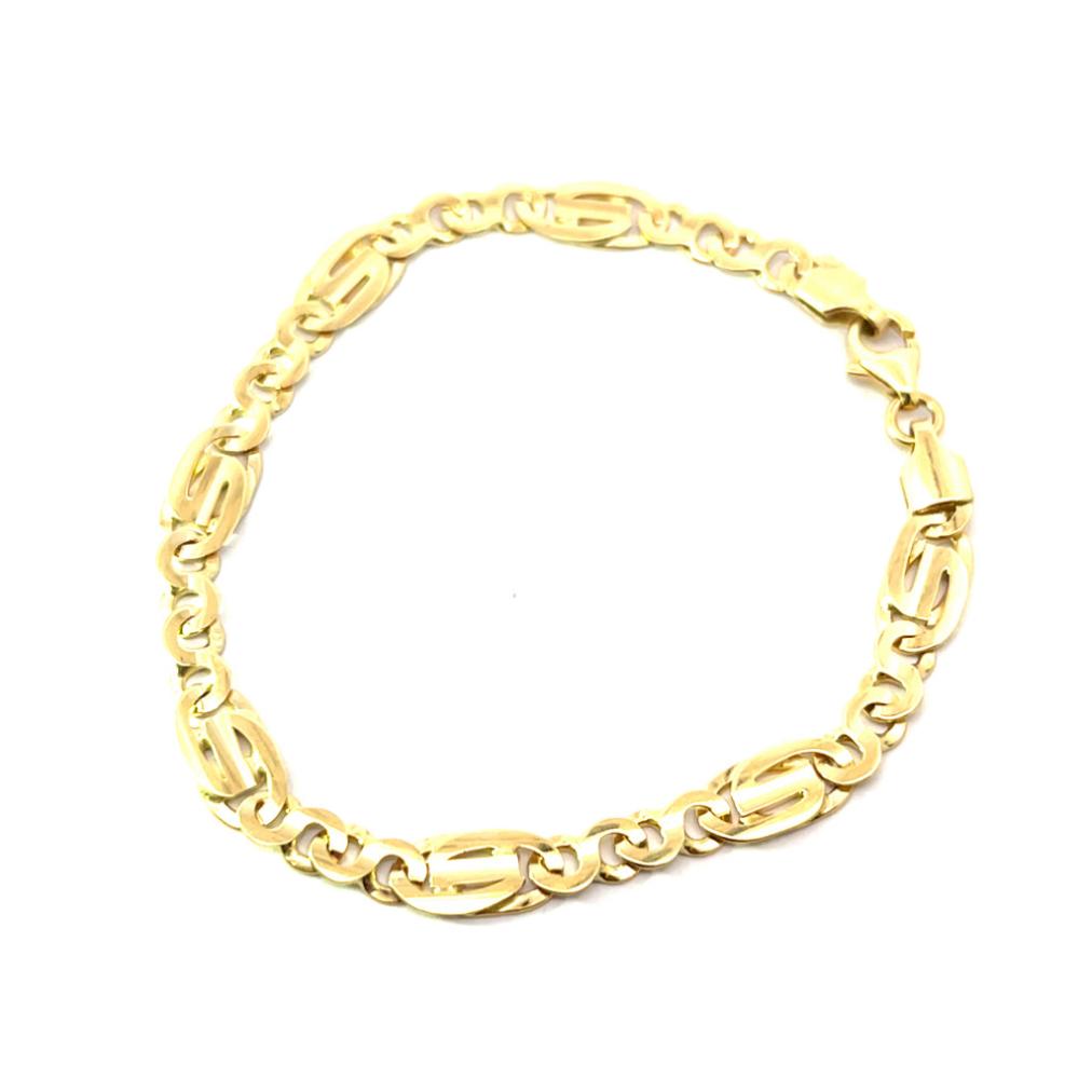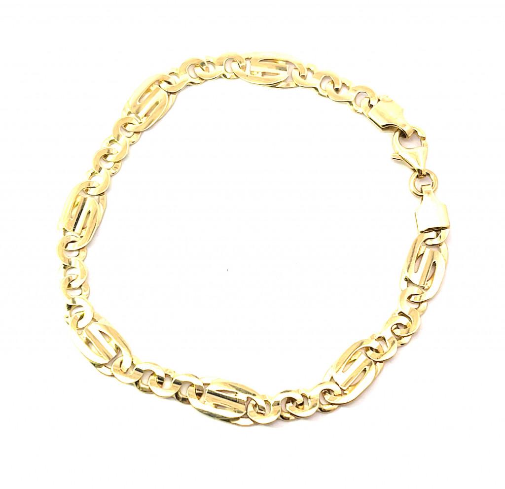 Zlatý náramek o ryzosti 585/1000, punc labuť. Váha 6,22 g, délka 16 cm, v nejširším bodě 6 mm.