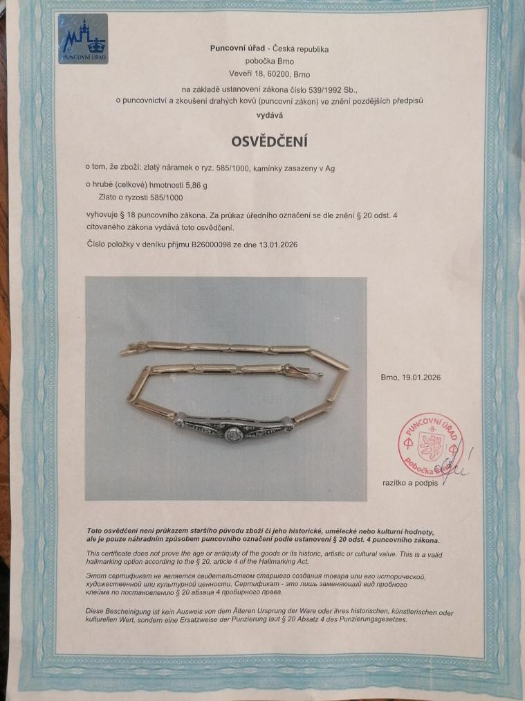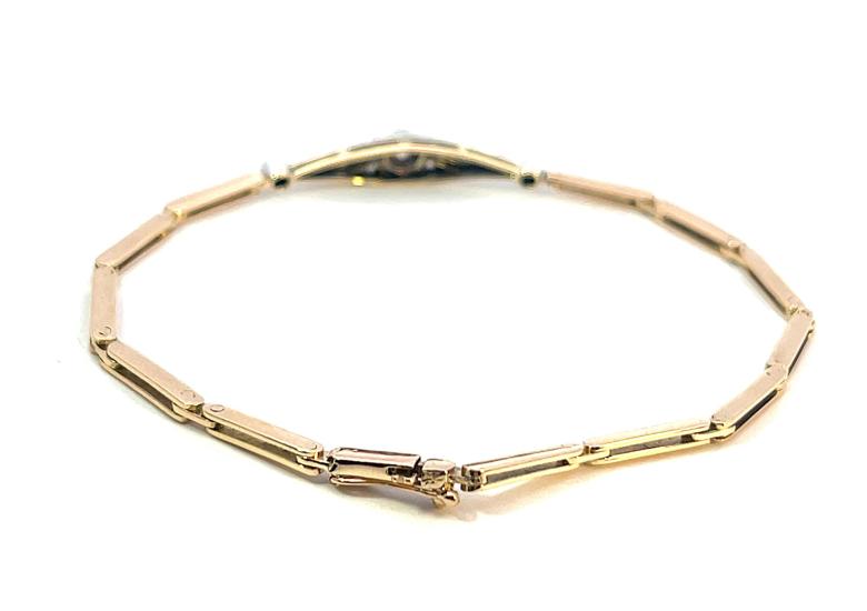Náramek z kombinace růžového zlata o ryzosti 585/1000 a stříbra (zasazení kamenů), osvědčení z PÚ. Váha 5,86 g, délka 16,8 cm, rozměr ozdobné části 28 x 5,5 mm, šířka náramku 2 mm. Kámen - přírodní diamant briliantového brusu - 1 ks - centrální kámen, cca 0,10 ct. Kámen - přírodní diamant staroevropského brusu - 8 ks, dohromady cca 0,14 ct - celkem je na náramku cca 0,24 ct.