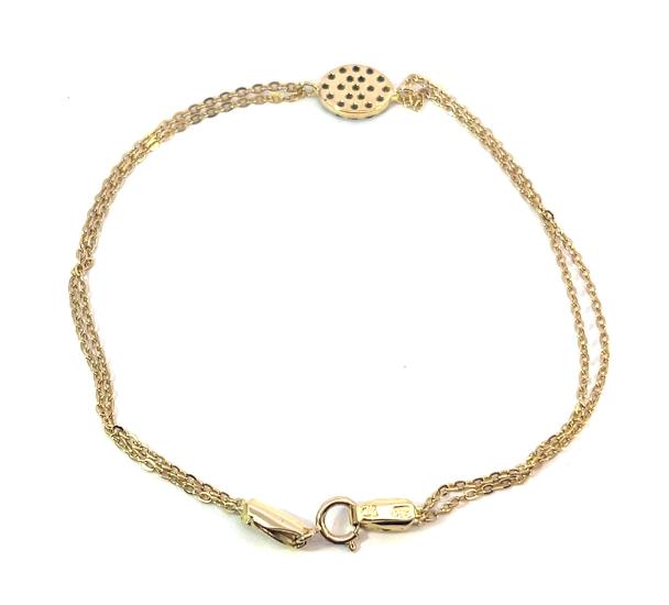 Zlatý náramek o ryzosti 750/1000, punc kohout. Váha 2,59 g, délka 17,8 cm, rozměr ozdoby 7 x 14 mm, náramek v nejširším bodě 1,5 mm. Kameny jsou syntetické.
