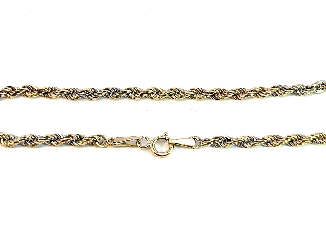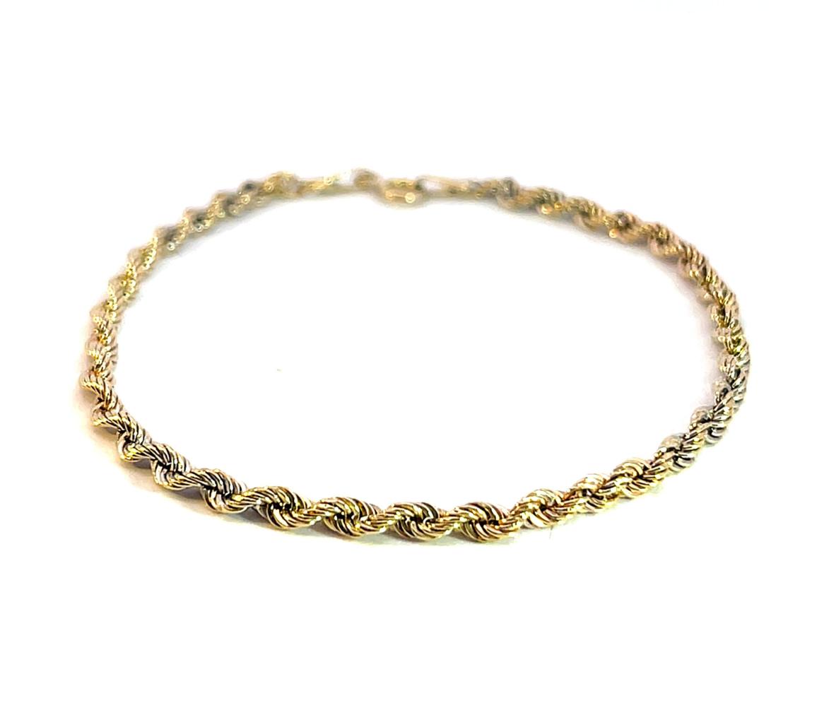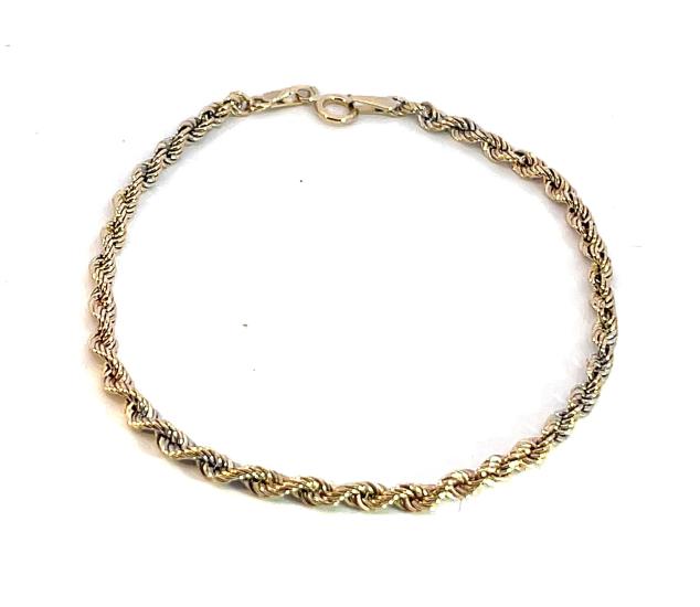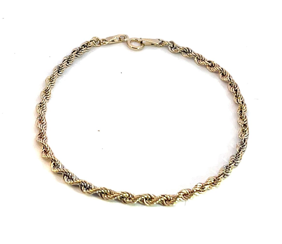 Náramek z kombinace žlutého, bílého a růžového zlata o ryzosti 585/1000, punc labuť. Váha 1,41 g, délka 17,7 cm, v nejširším bodě 3 mm