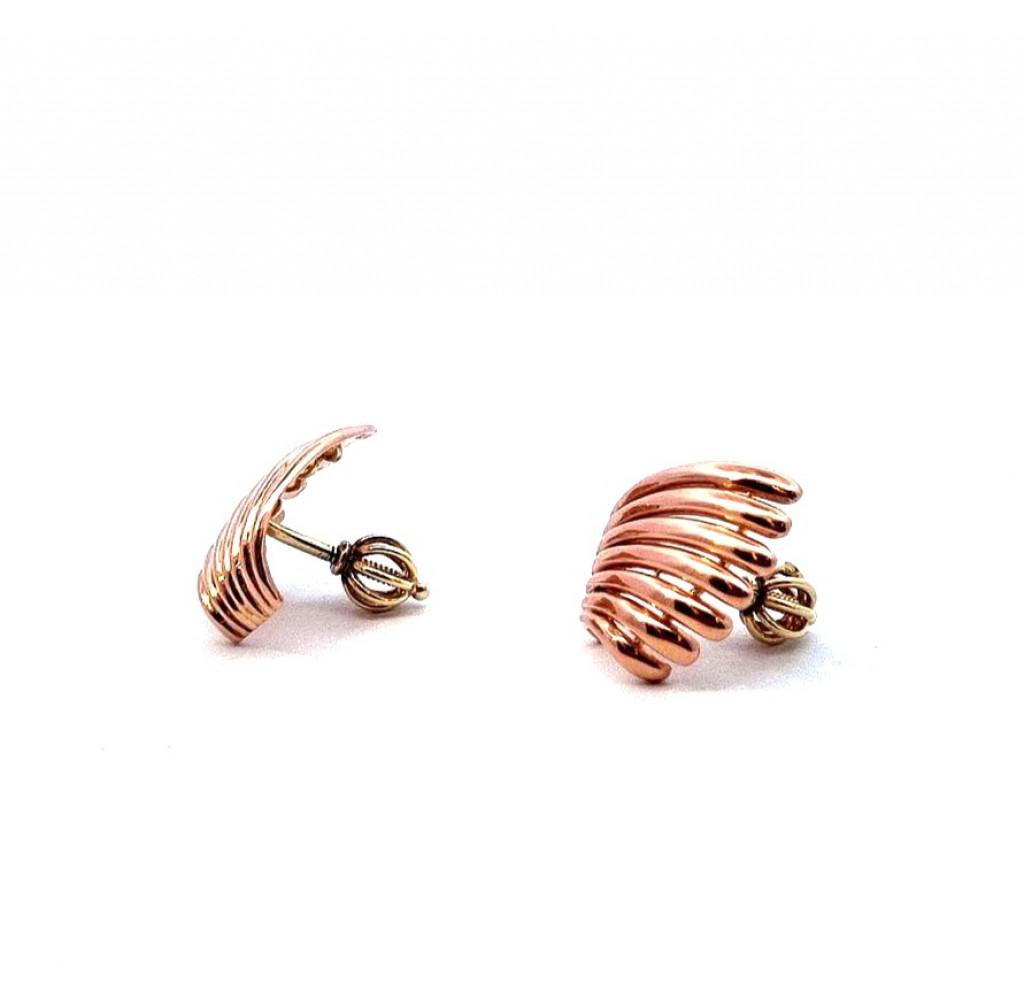 Náušnice z růžového zlata o ryzosti 585/1000, punc lvíček. Váha 4,16 g, výška 15 mm, v nejširším bodě 15 mm.