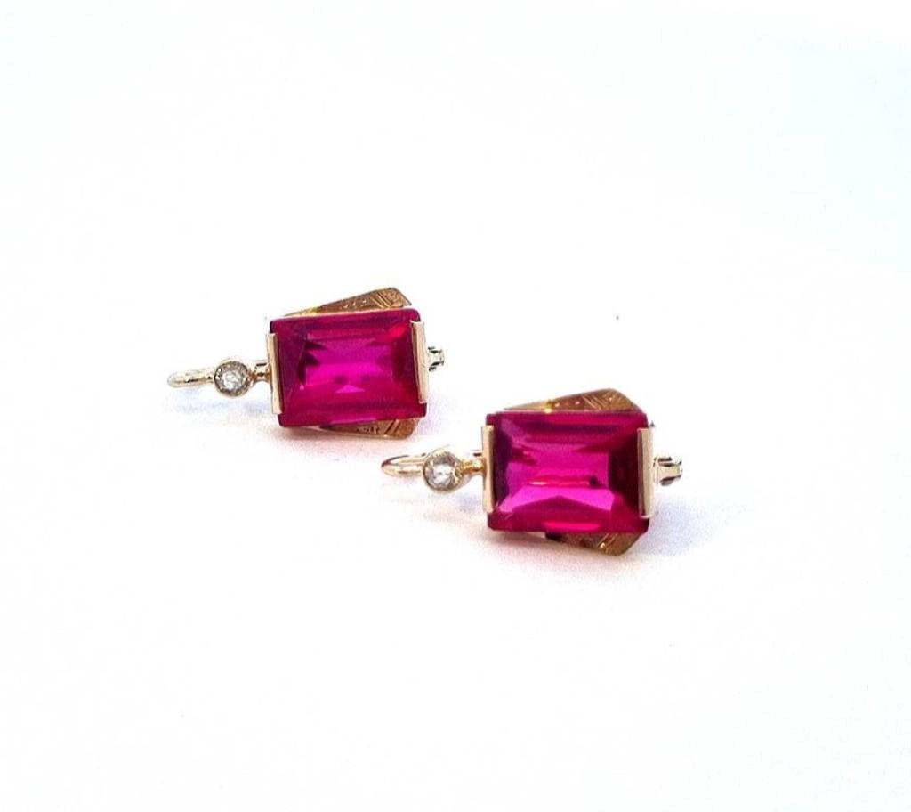 Starožitné zlaté náušnice s červeným kamenem a leukosafírem, visací