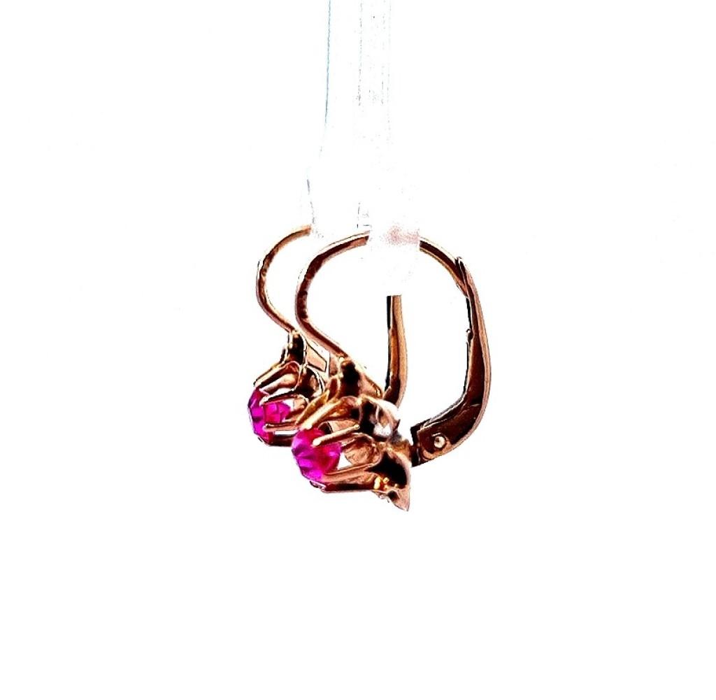 Zlaté náušnice o ryzosti 580/1000, punc liška, Rakousko - Uhersko, váha 1,88 g, výška celkem 15 mm, průměr kamene 4 mm. Kámen je syntetický.