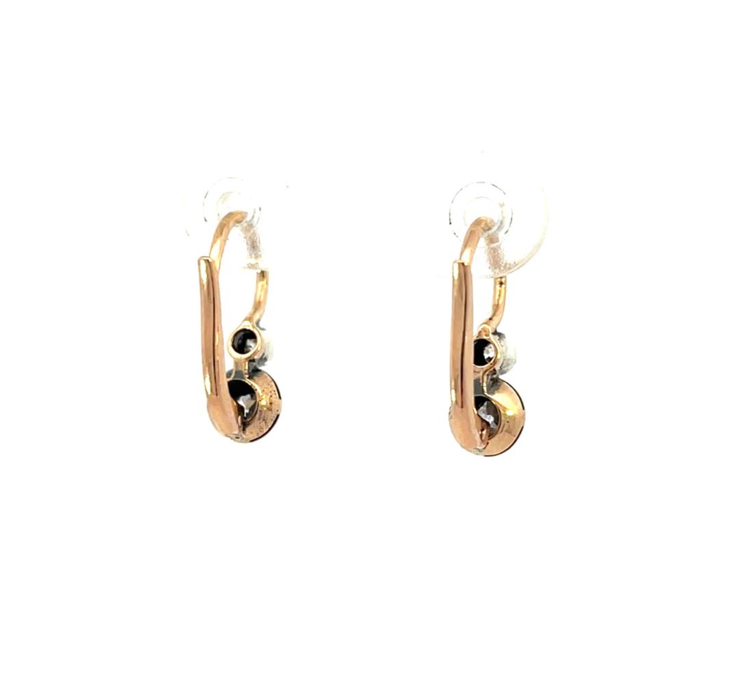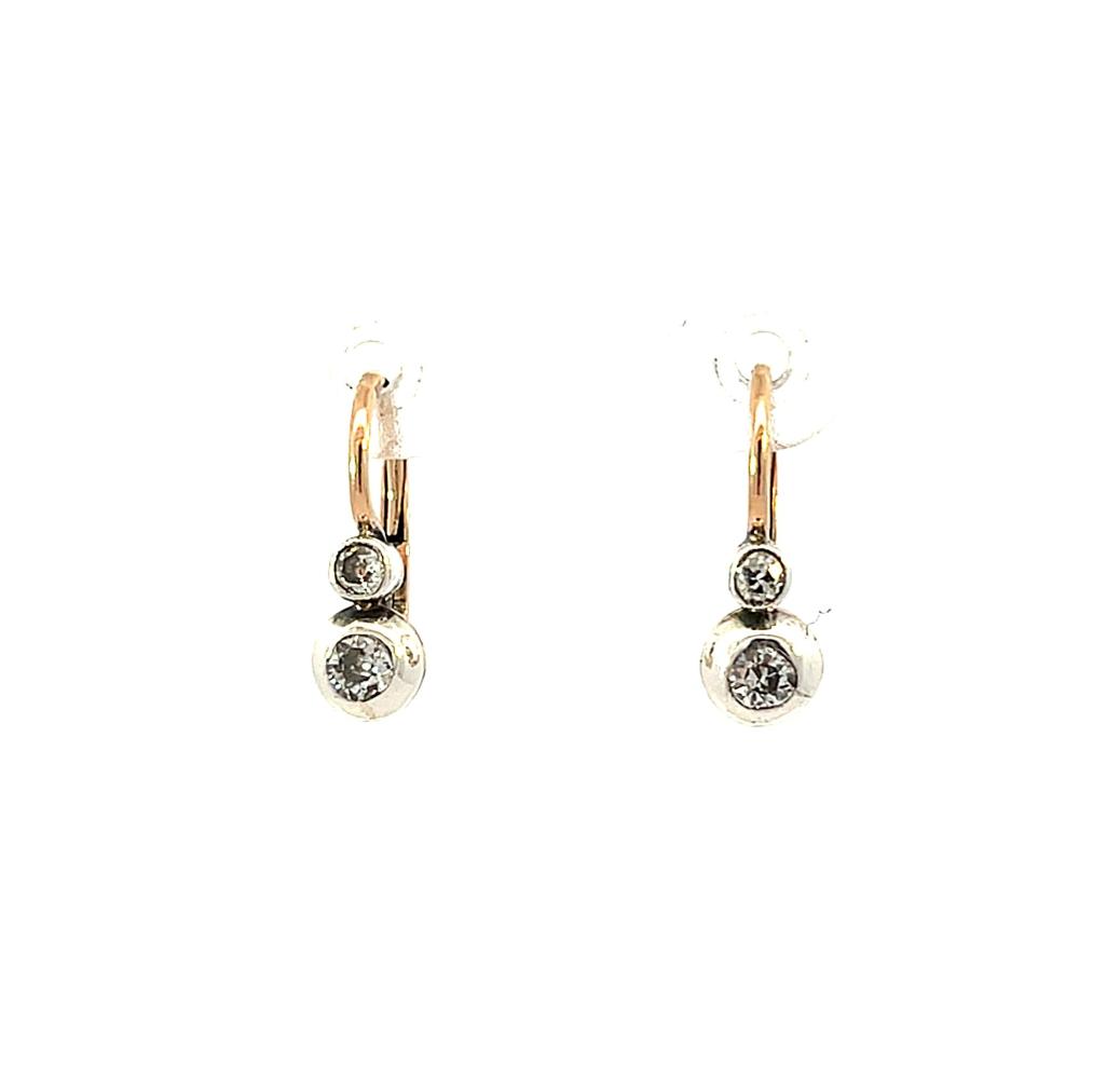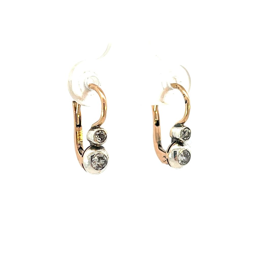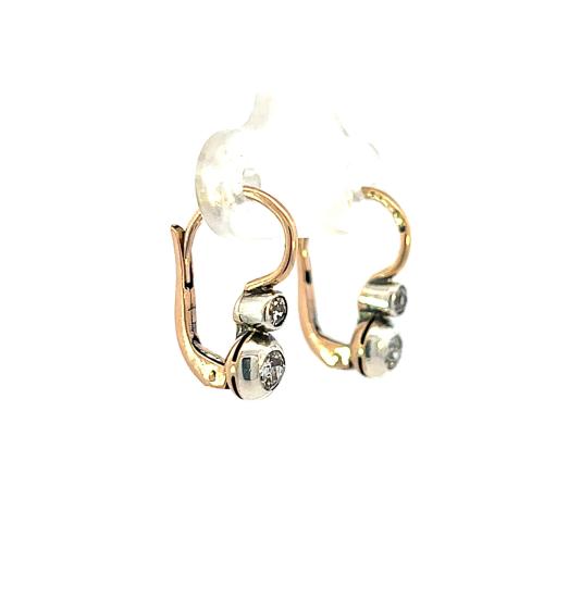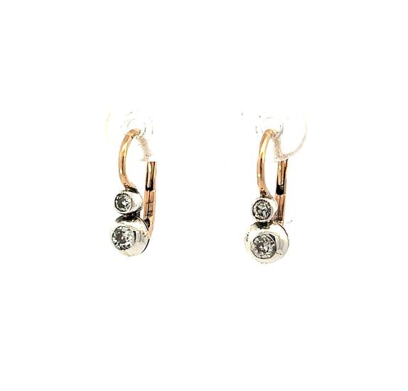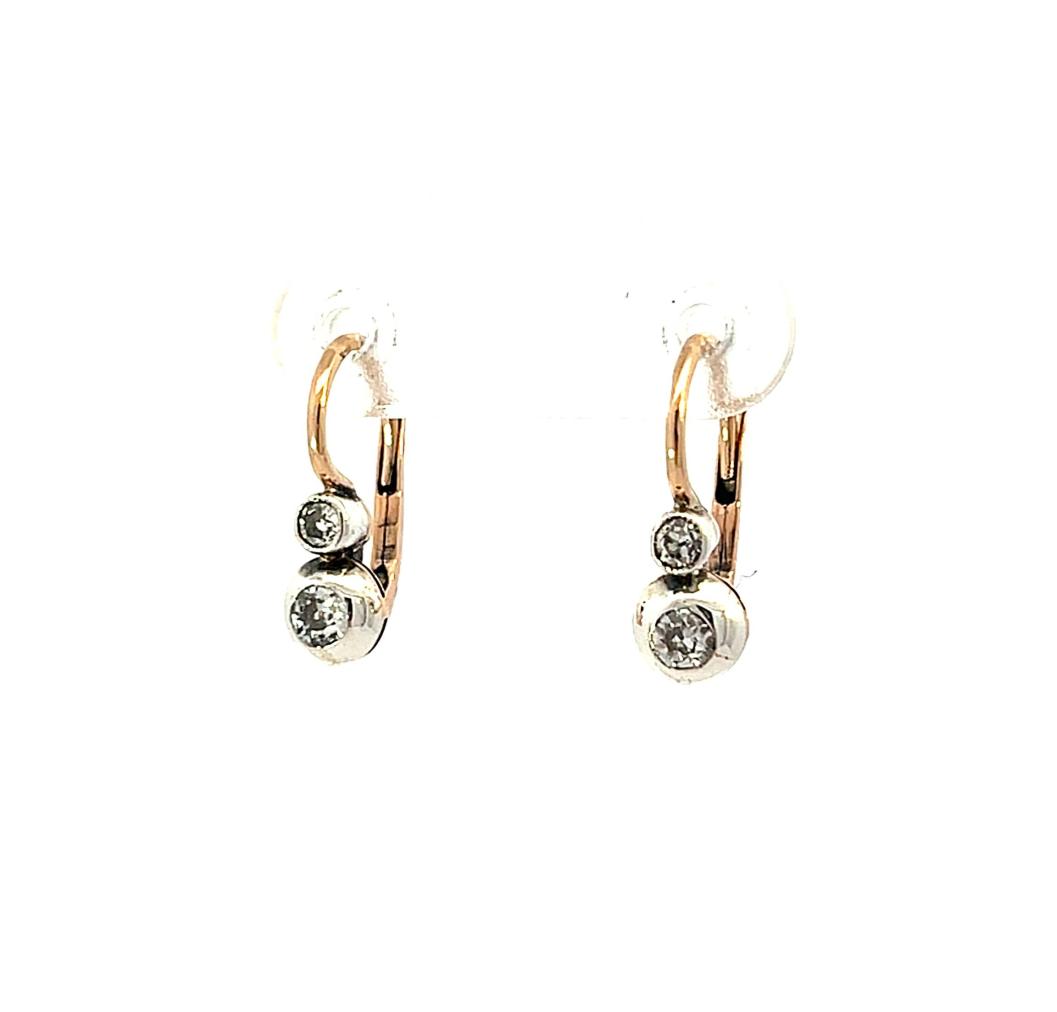 Náušnice z kombinace růžového a bílého zlata o ryzosti 580/1000, punc liška. Váha 1,84 g, výška 15,5 mm, v nejširším bodě 5 mm. Kámen - přírodní diamant staroevropského brusu - 4 ks, větší kameny: 2 ks, cca 0,08 ct, menší kameny: 2 ks, cca 0,06 ct každý - dohromady cca 0,28 ct.