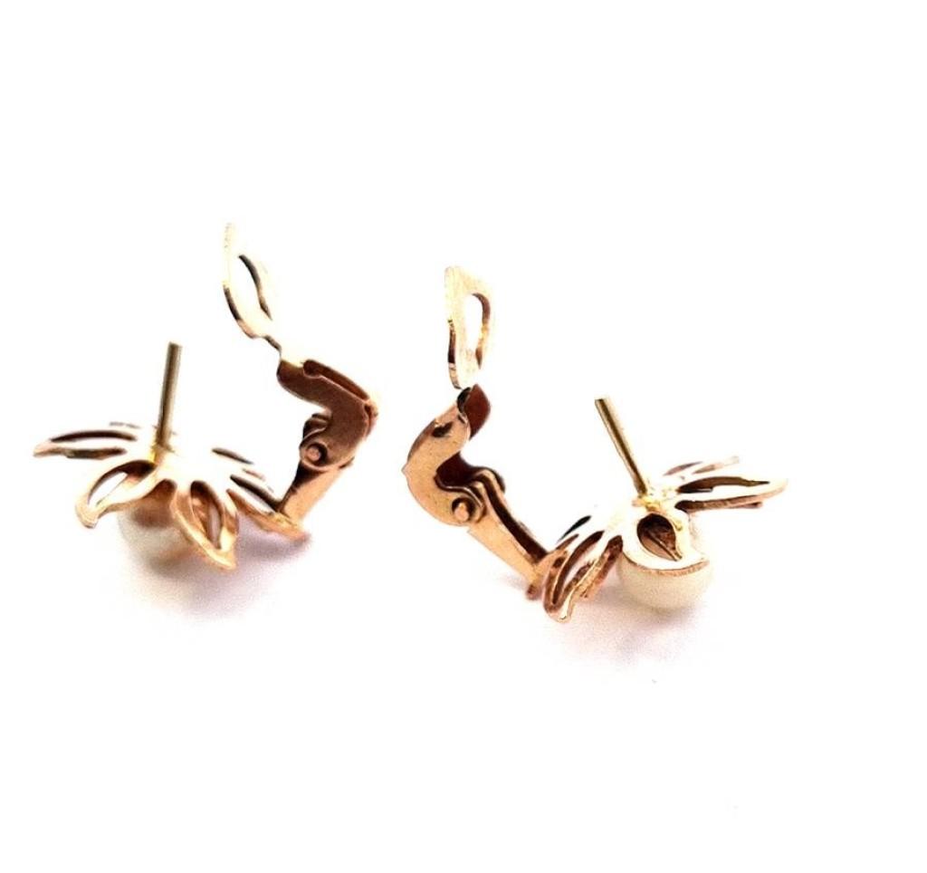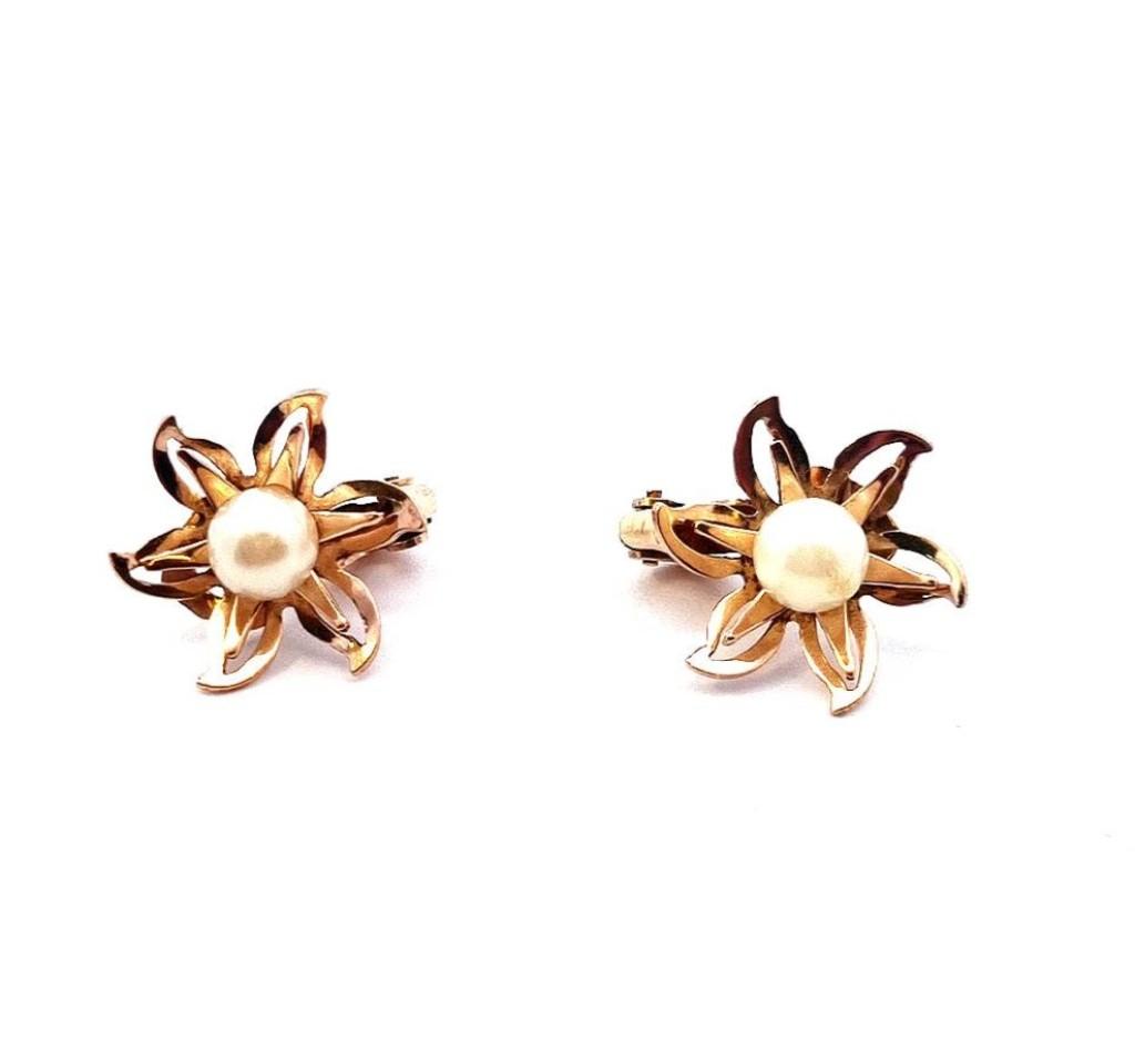 Zlaté náušnice o ryzosti 585/1000, punc lyra. Váha 6,17 g, průměr 19 mm, průměr perly 6,5 mm.