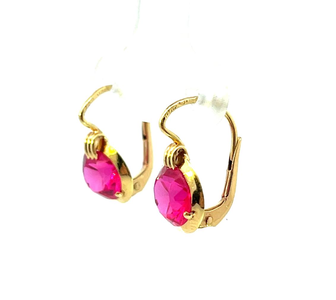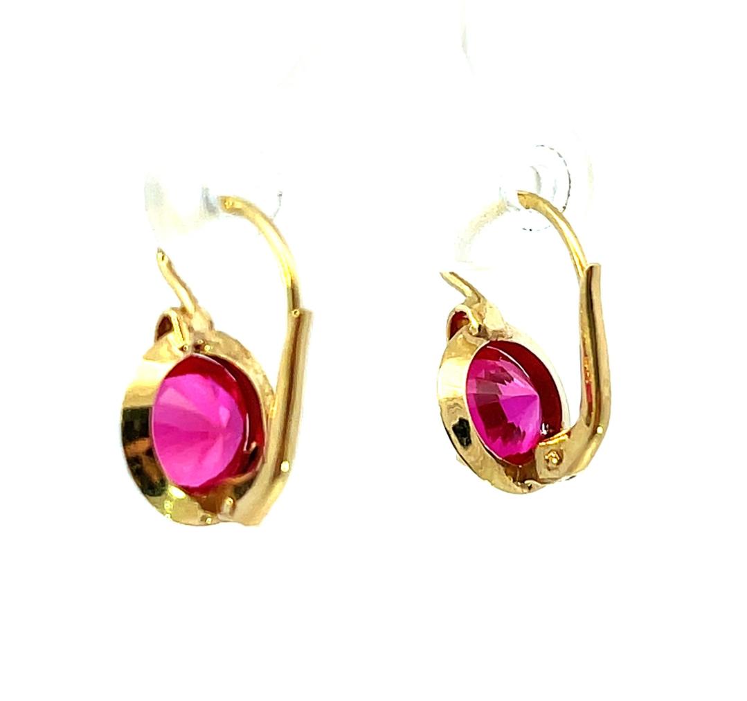 Zlaté náušnice o ryzosti 585/1000, punc lvíček. Váha 1,61 g, výška 14 mm, průměr ozdoby 9 mm, průměr kamene 7 mm. Kameny jsou syntetické.