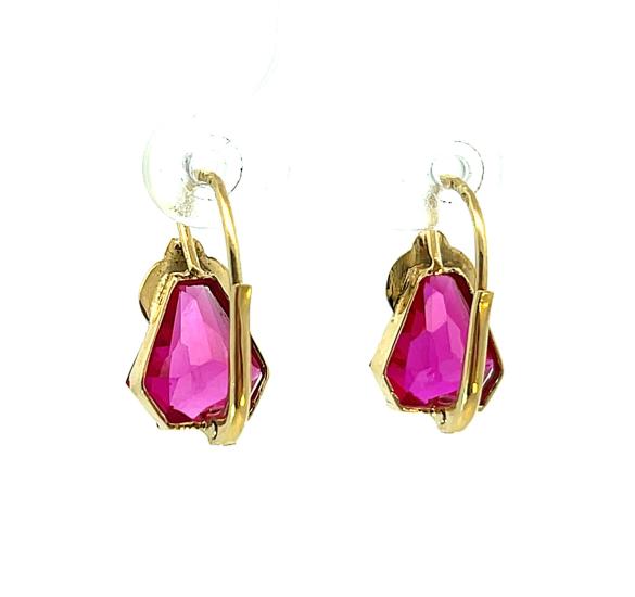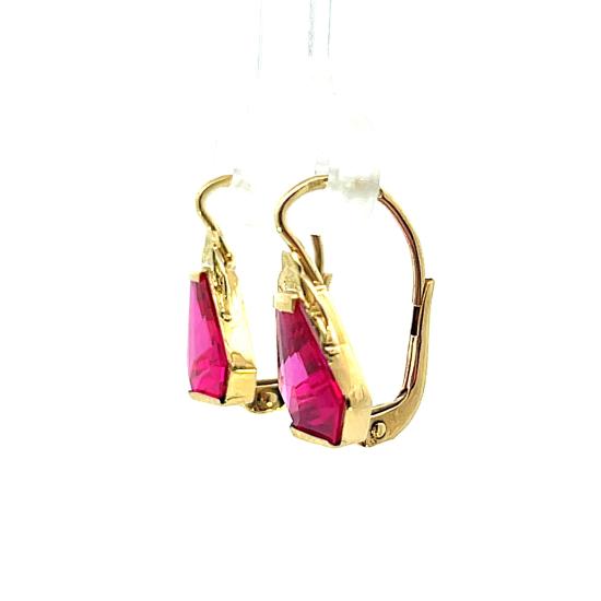Zlaté náušnice o ryzosti 585/1000, punc lvíček. Váha 2,57 g, výška 17 mm, v nejširším bodě 9 mm. Kameny jsou syntetické.