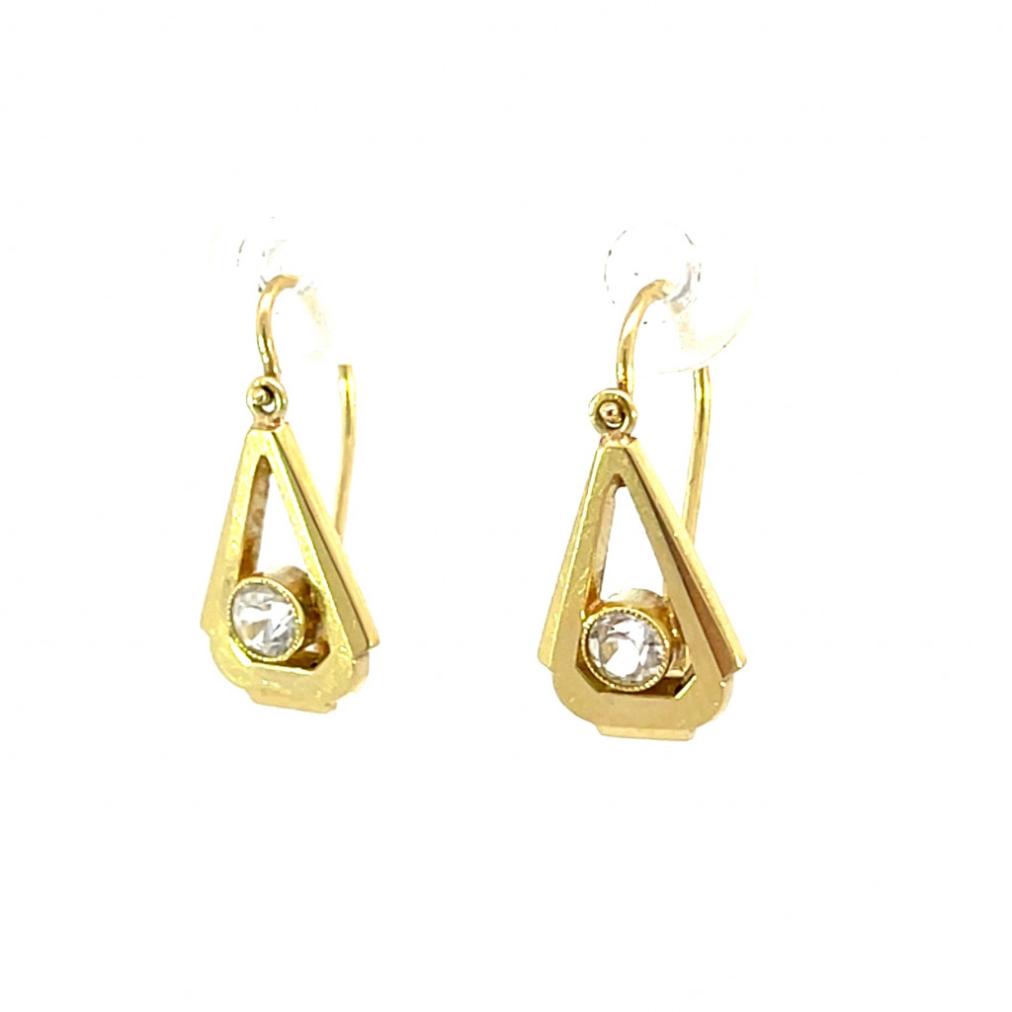 Starožitné náušnice se zapínáním ve předu ze zlata o ryzosti 585/1000 s puncem lvíček. Váha 1,37 g, celková výška je 18 mm. Rozměry ozdobné části jsou 13 x 8 mm. Rozměry kamenů jsou 4 mm. Kameny jsou syntetické.