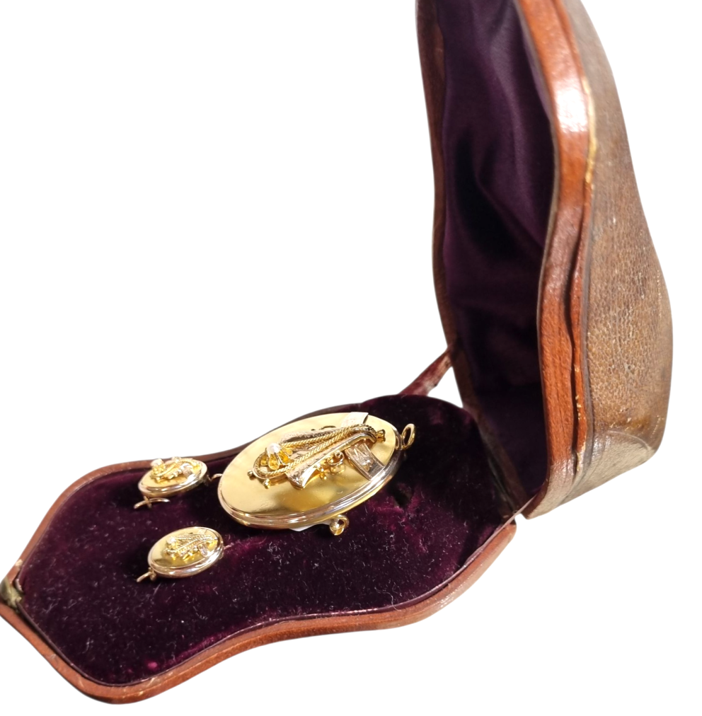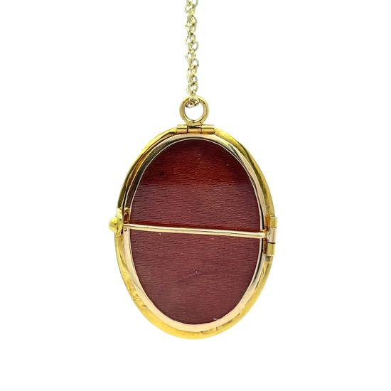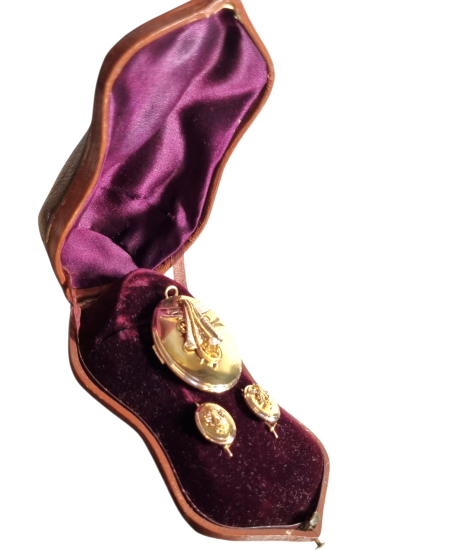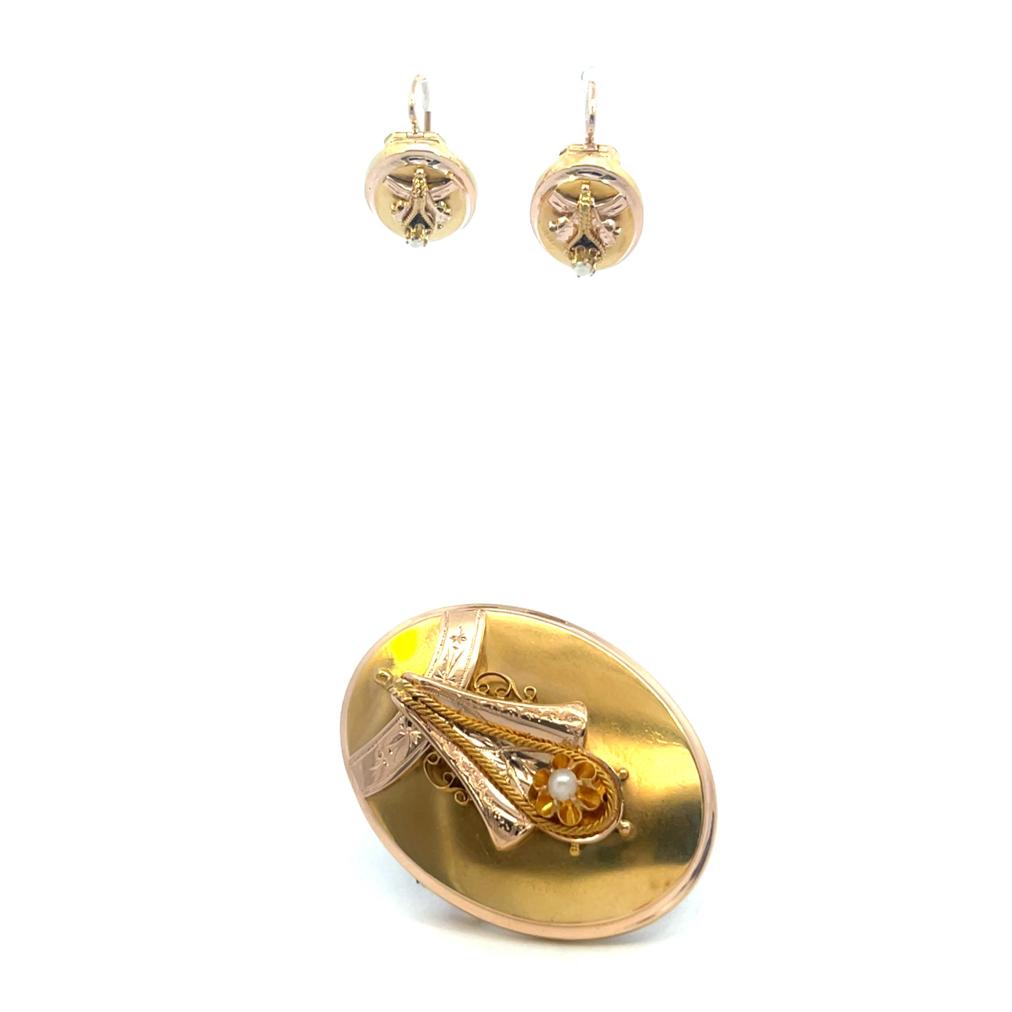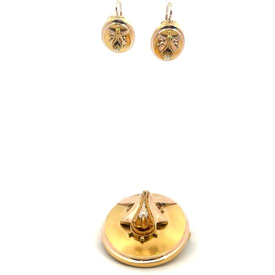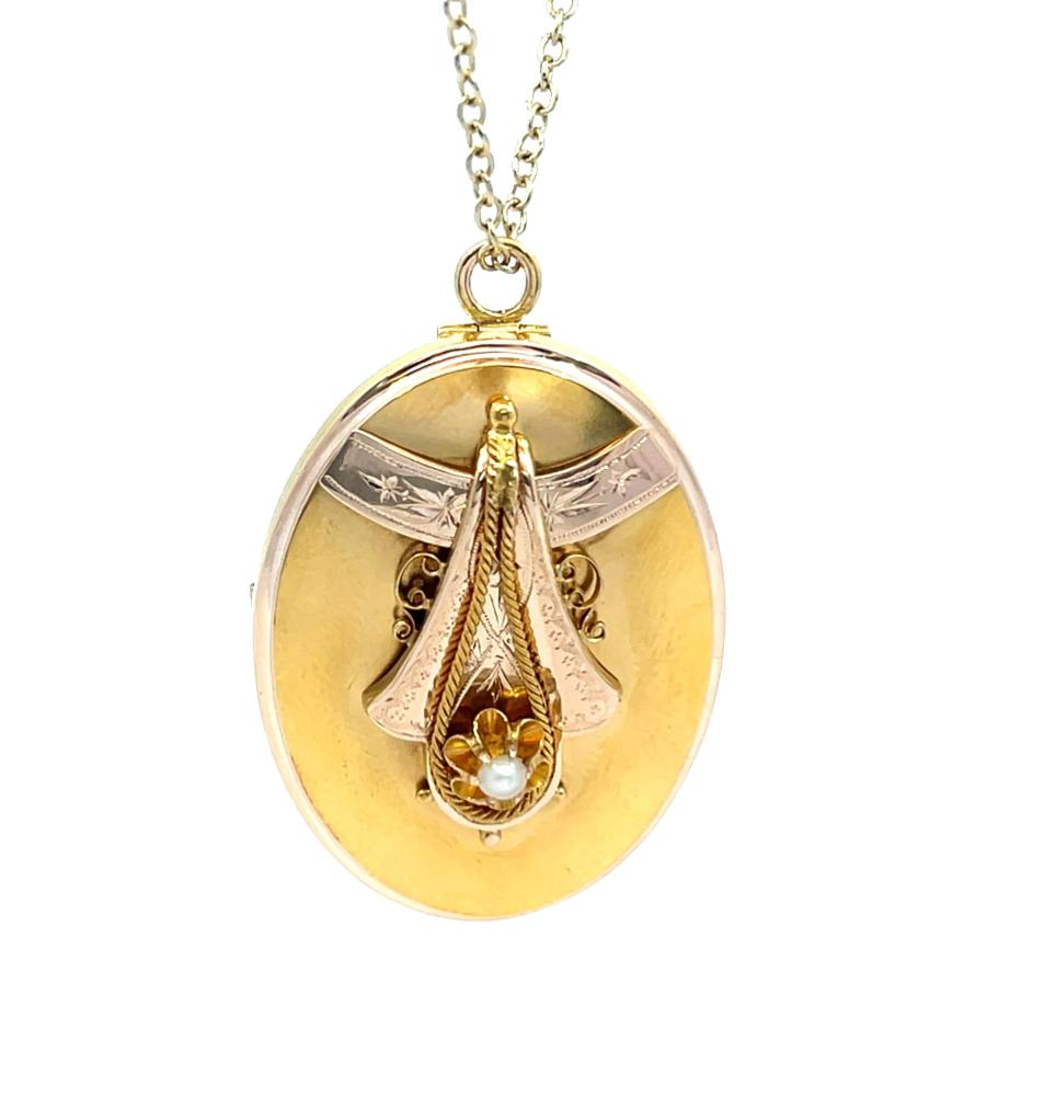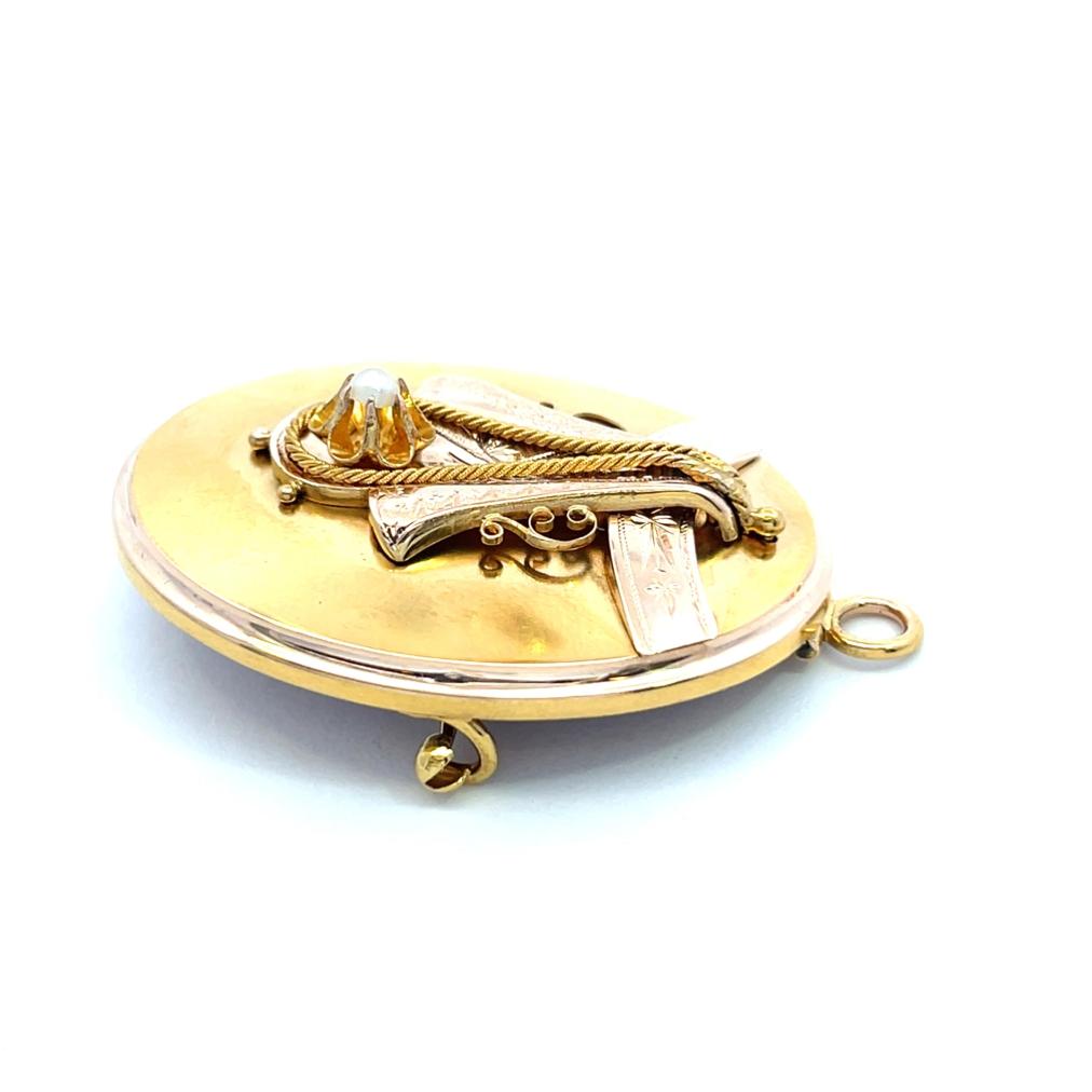 Starožitný zlatý přívěs/brož z kombinace žlutého a růžového zlata o ryzosti 580/1000, punc liška. Váha 8,85 g, výška včetně očka 46 mm, v nejširším bodě 30,5 mm, průměr perly 3 mm.