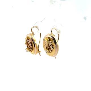 Zlaté náušnice z kombinace žlutého a růžového zlata o ryzosti 580/1000, punc liška. Váha 2,71 g, výška 20 mm, v nejširším bodě 11,5 mm, perlička 2 mm.