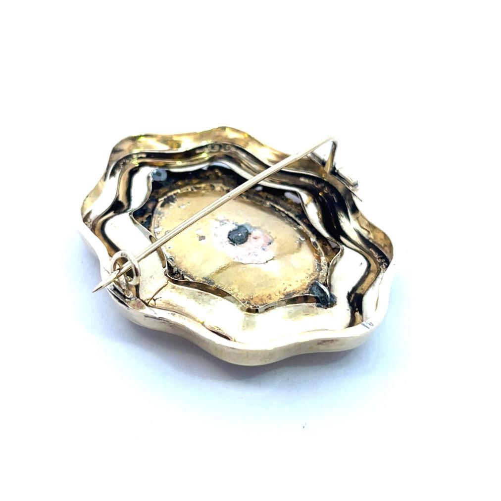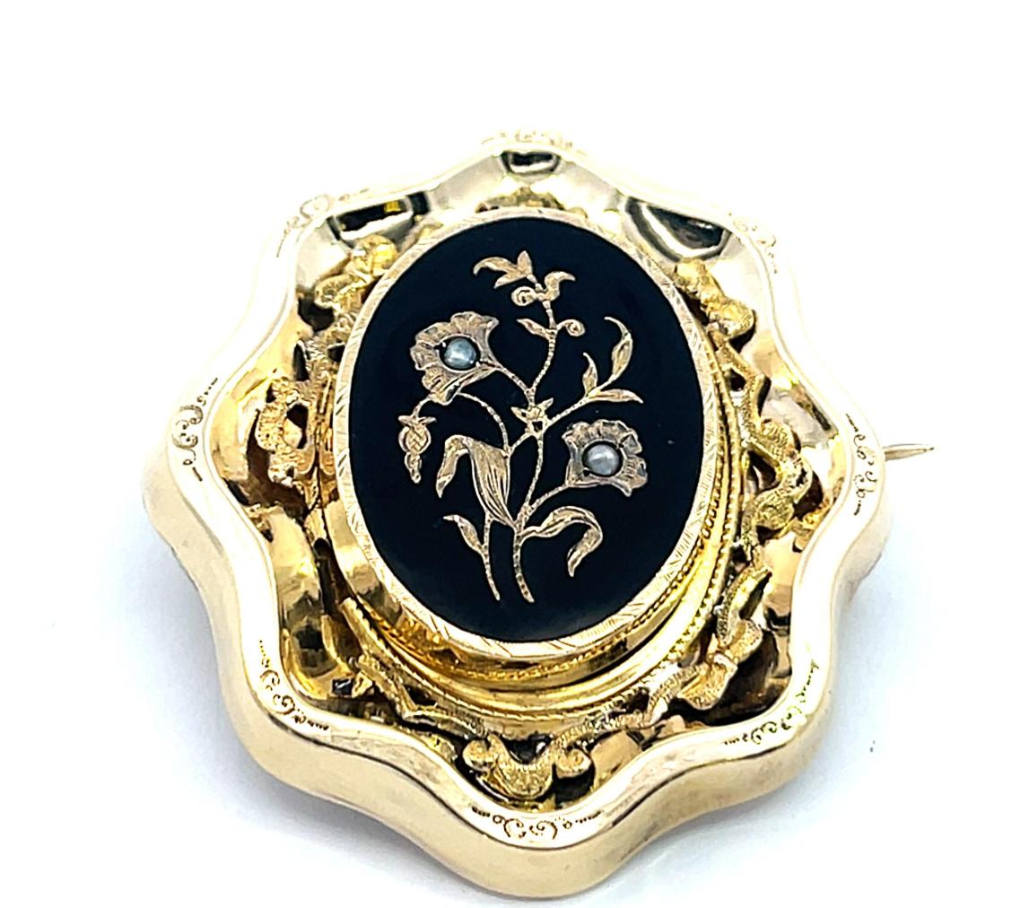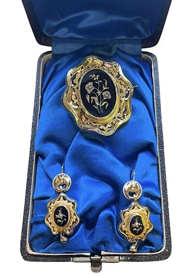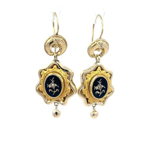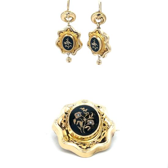 Starožitný zlatý set s broží a náušnicemi s perličkou a smaltem - Biedermeier