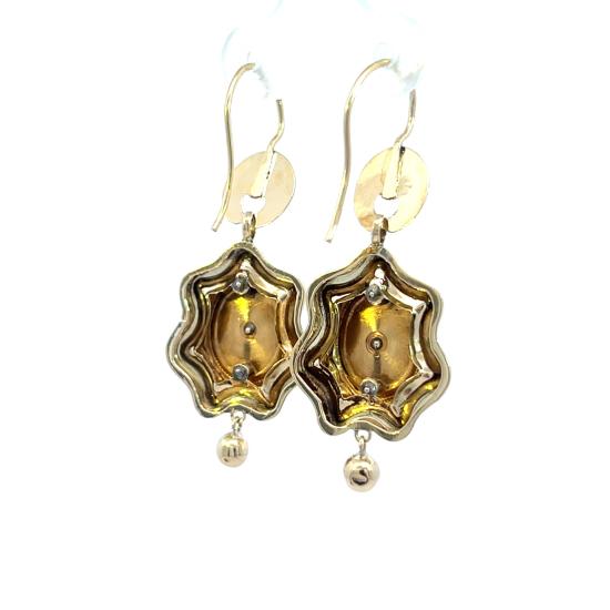 Starožitné zlaté náušnice o ryzosti 585/1000, punc AW. Váha 2,81 g, výška 42 mm, v nejširším bodě 16,5 mm.