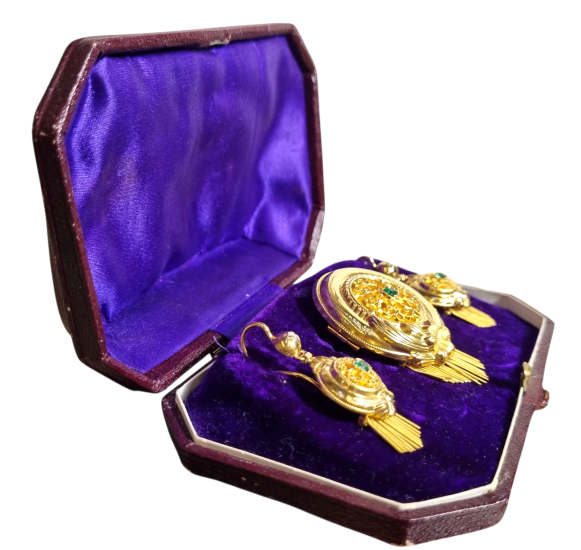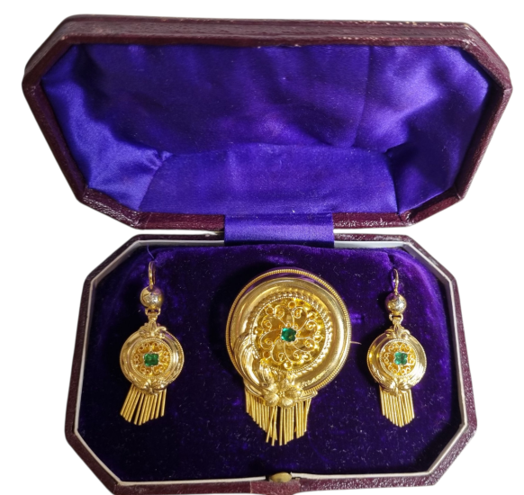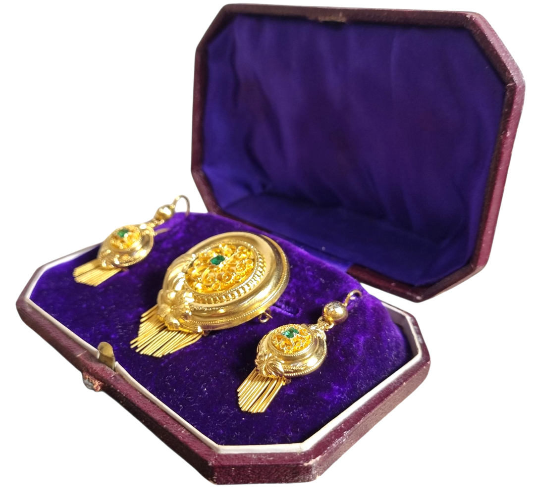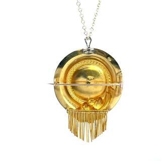 Starožitný zlatý přívěs, který lze používat i jako brož, o ryzosti 580/1000, punc liška. Váha 7,96 g, průměr 36 mm, výška včetně očka 56 mm, kámen 3 x 3 mm. Kámen je syntetický. 3 ozdobné tyčinky jsou lehce deformované, viz foto. Na zlatě je pár mělkých rýh, přirozeně vzhledem ke stáří šperku.