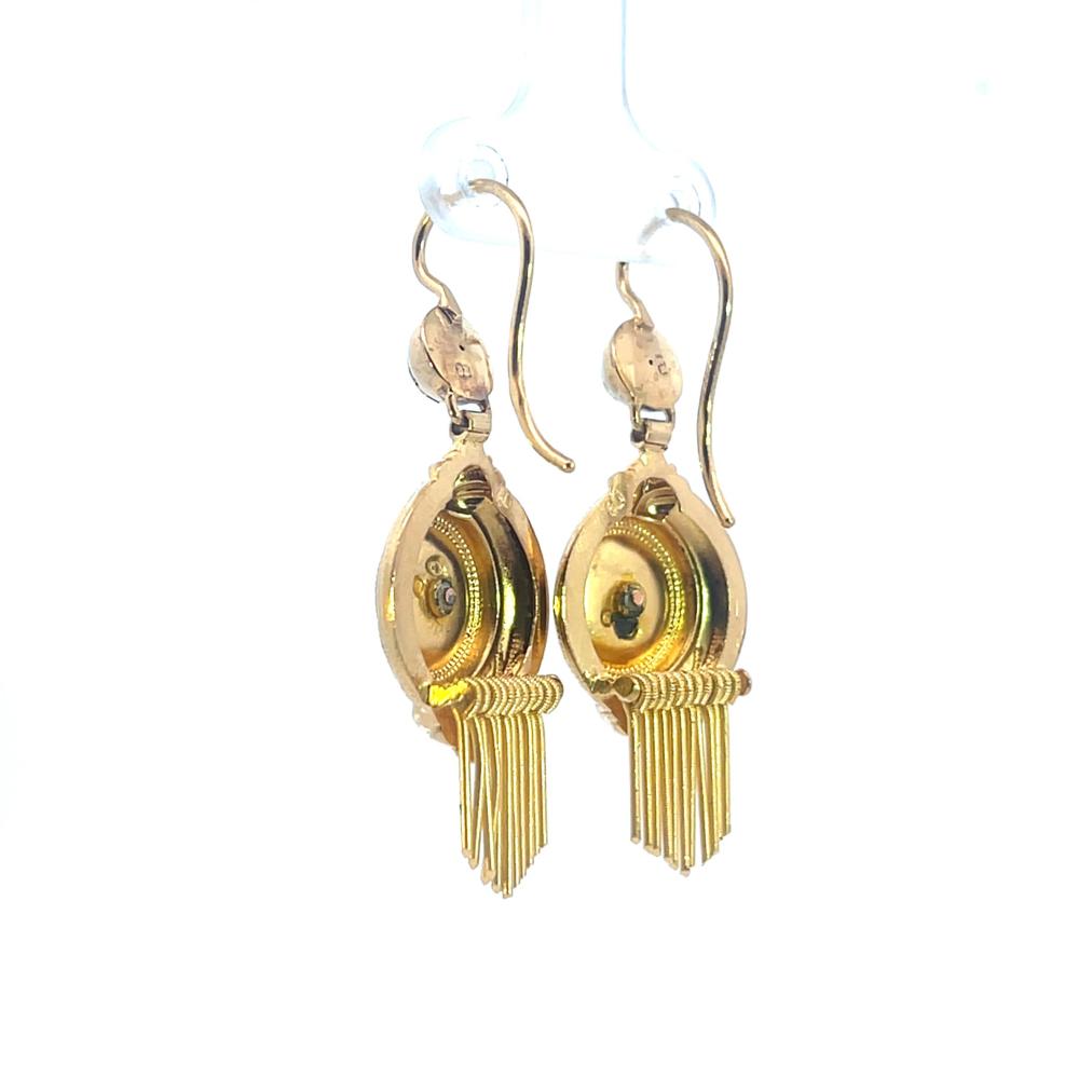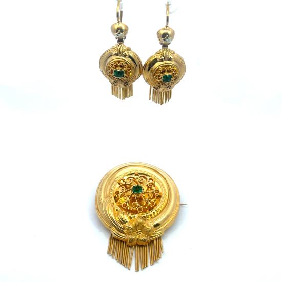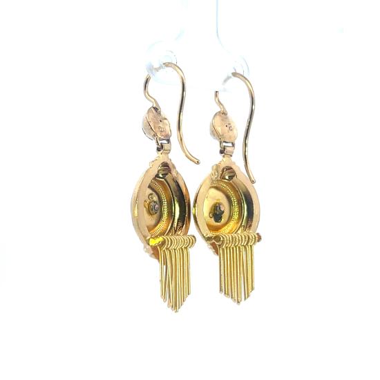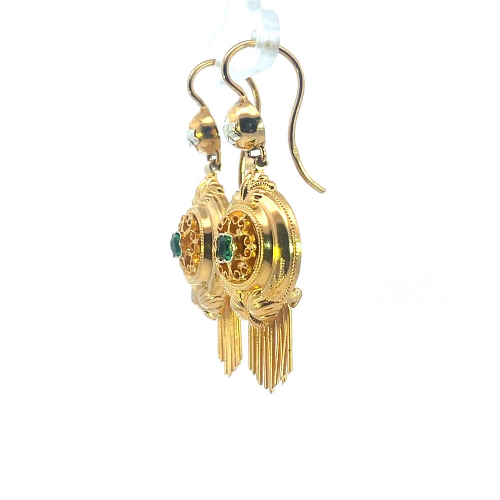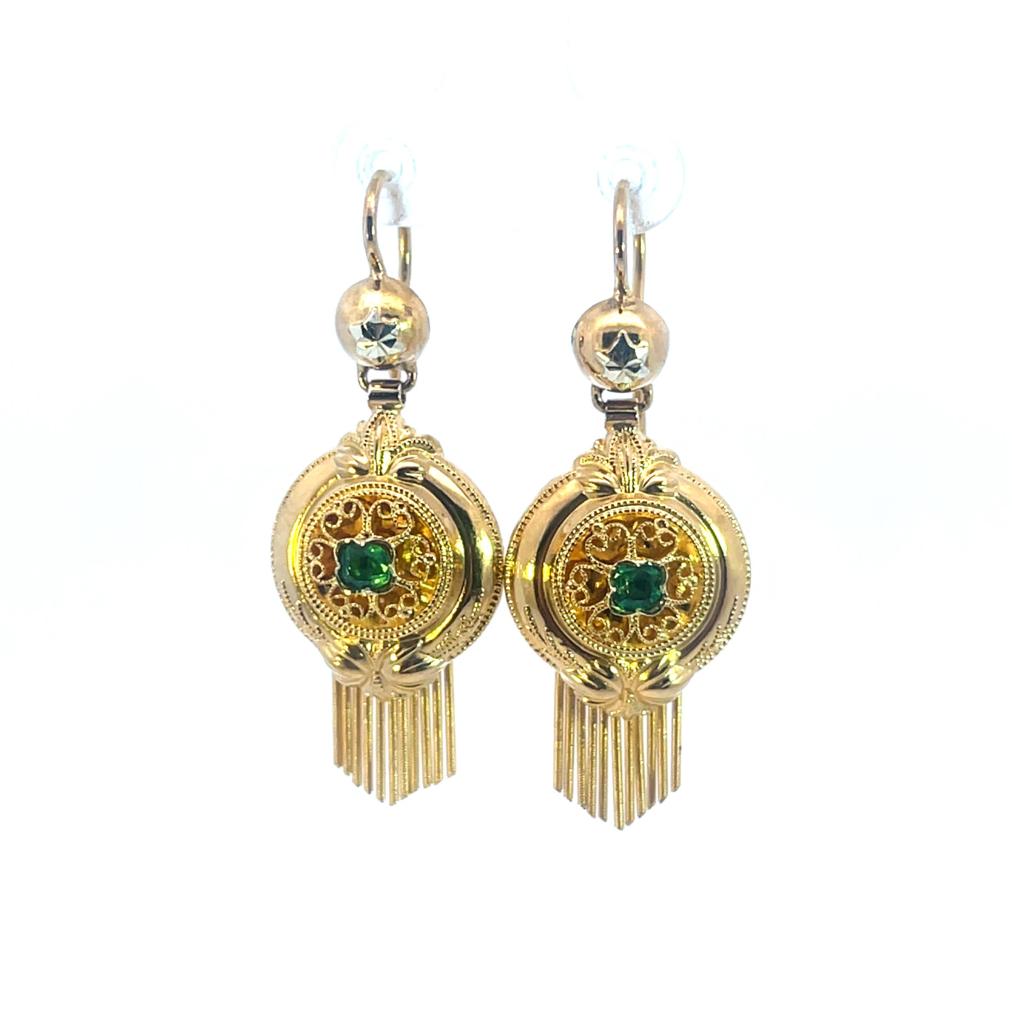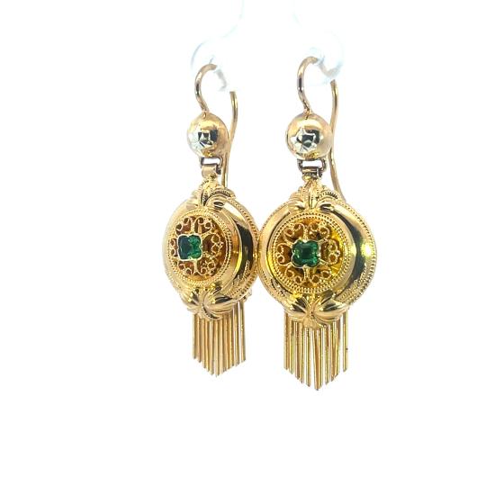 Starožitné zlaté náušnice o ryzosti 580/1000, punc liška. Váha 6,44 g, výška 46 mm, průměr kruhové ozdoby 17 mm, rozměr kamene 3 x 3 mm. Kámen je syntetický. Ze zadní strany je stopa po letování.