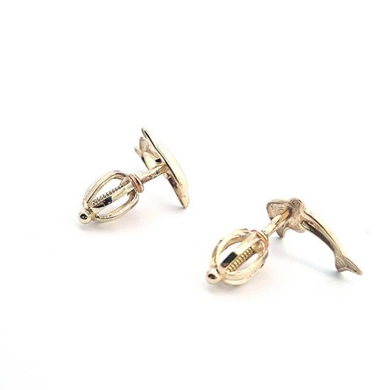 Drobné náušničky ze žlutého zlata o ryzosti 585/1000 s puncem labutě ve tvaru delfínků. Zapínání je na šroubek. Rozměr delfína od ocasu po hlavu je 9 mm.