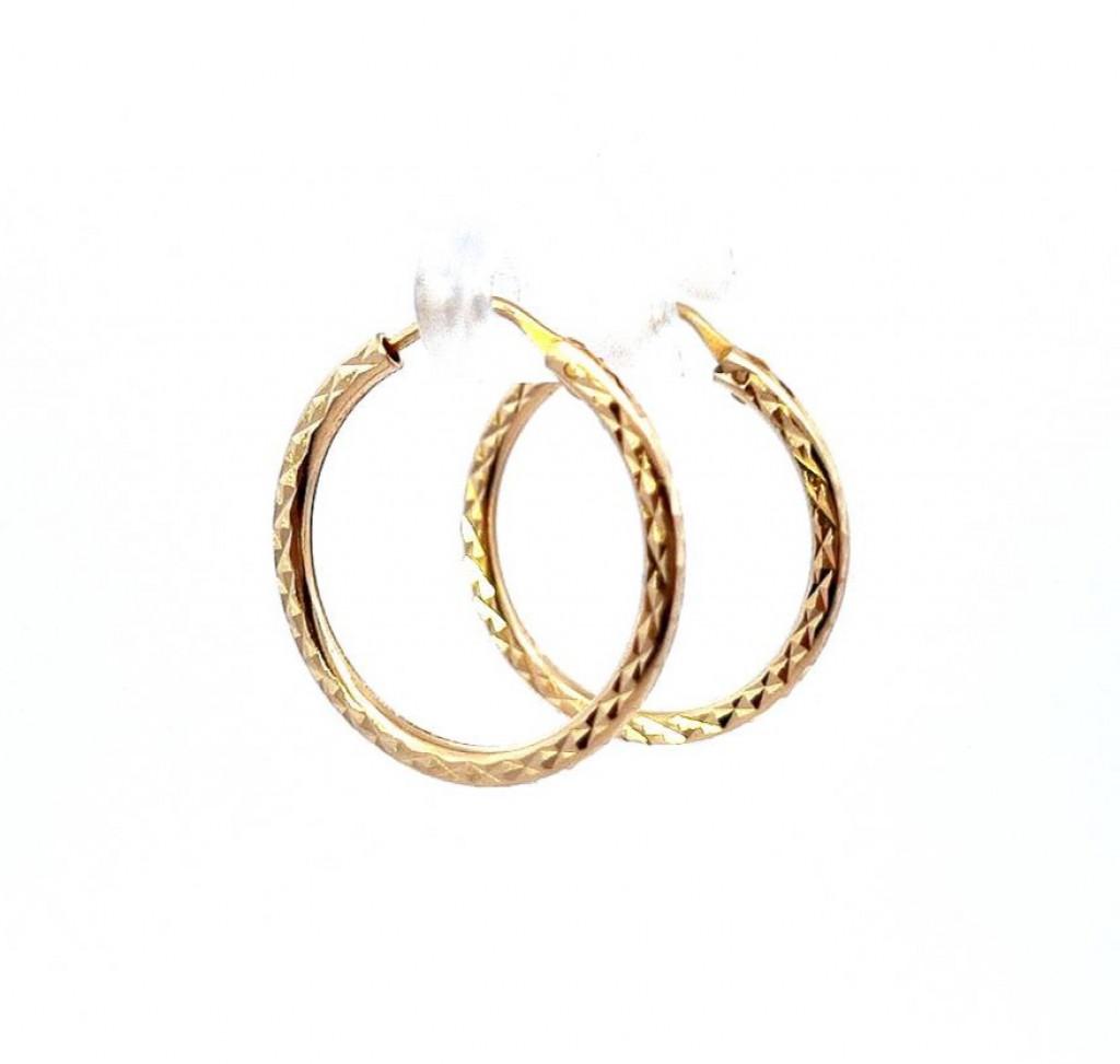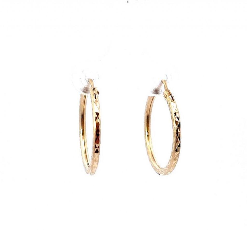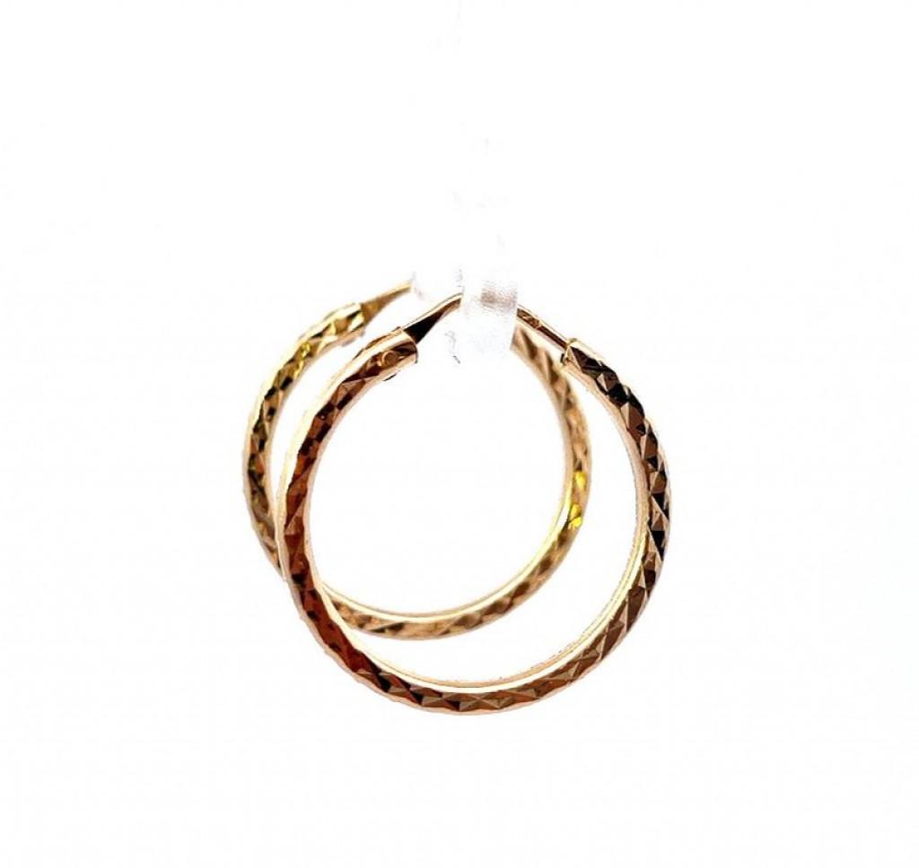 Zlaté náušnice, kruhy. Ryzost 585/1000, punc labuť. Váha 1,74 g, vnitřní průměr 17 mm, šířka kruhu 2 mm.