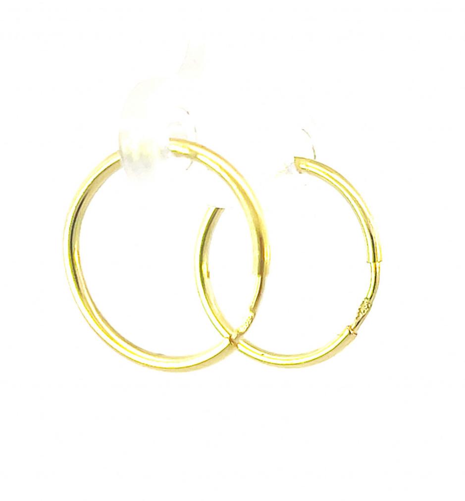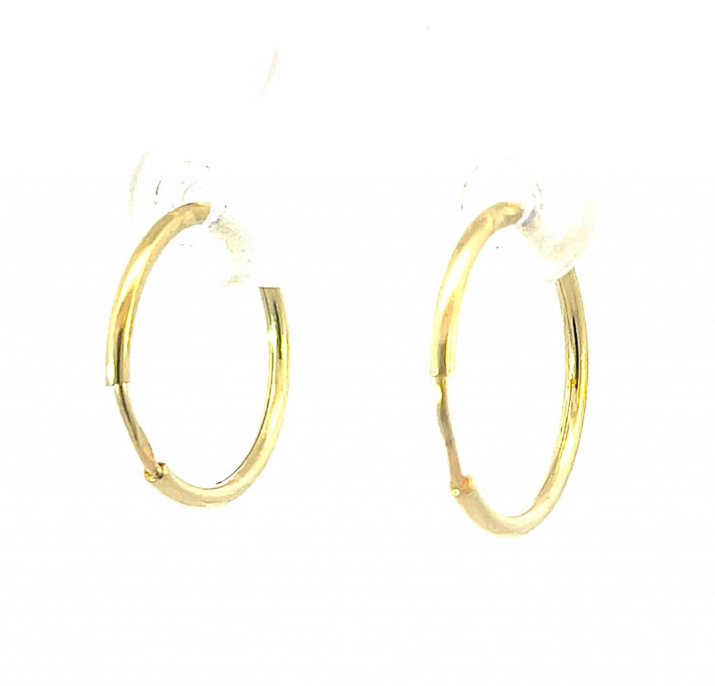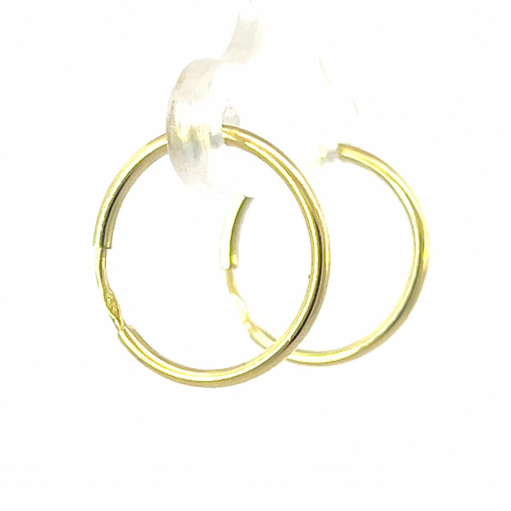 Zlaté náušnice o ryzosti 585/1000, punc labuť. Váha 0,64 g, průměr 15 mm, v nejširším bodě 1 mm.