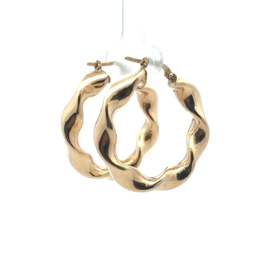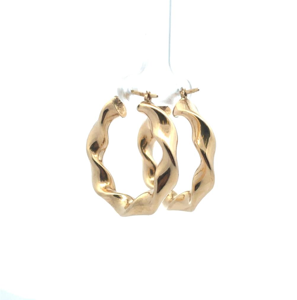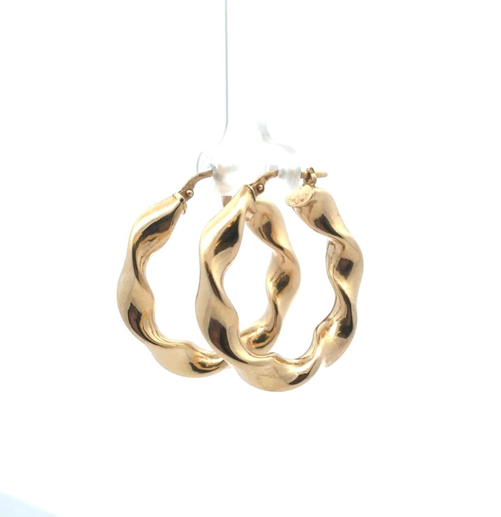 Zlaté náušnice o ryzosti 585/1000, punc labuť. Váha 4,84 g, průměr 31,5 mm, v nejširším bodě 6 mm.