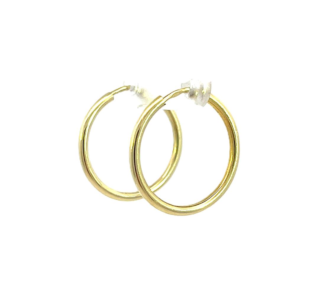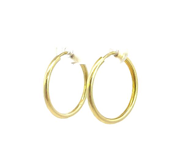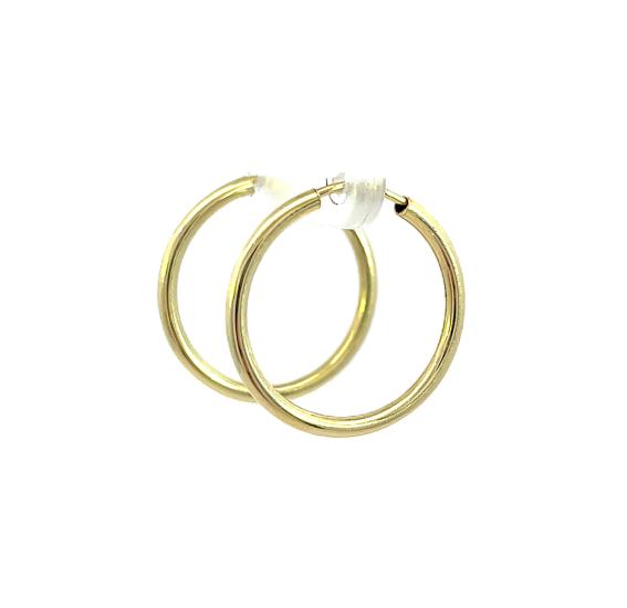 Zlaté náušnice o ryzosti 585/1000, punc labuť. Váha 1,32 g, průměr 20,5 mm, v nejširším bodě 2 mm.