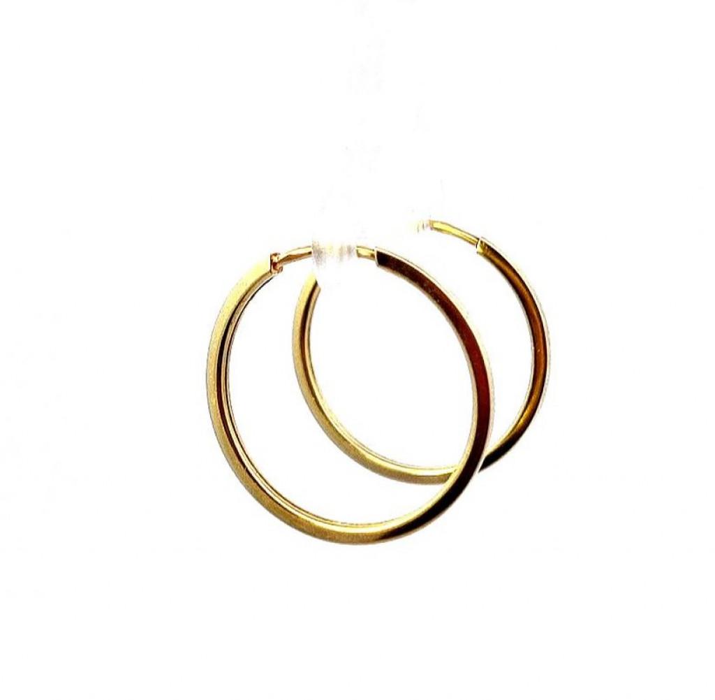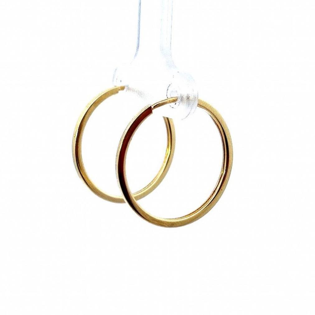 Zlaté náušnice, kruhy ze žlutého zlata o ryzosti 585/1000, punc labuť. Váha 2,23 g, vnitřní průměr 20 mm, šířka kroužku 1,5 mm.