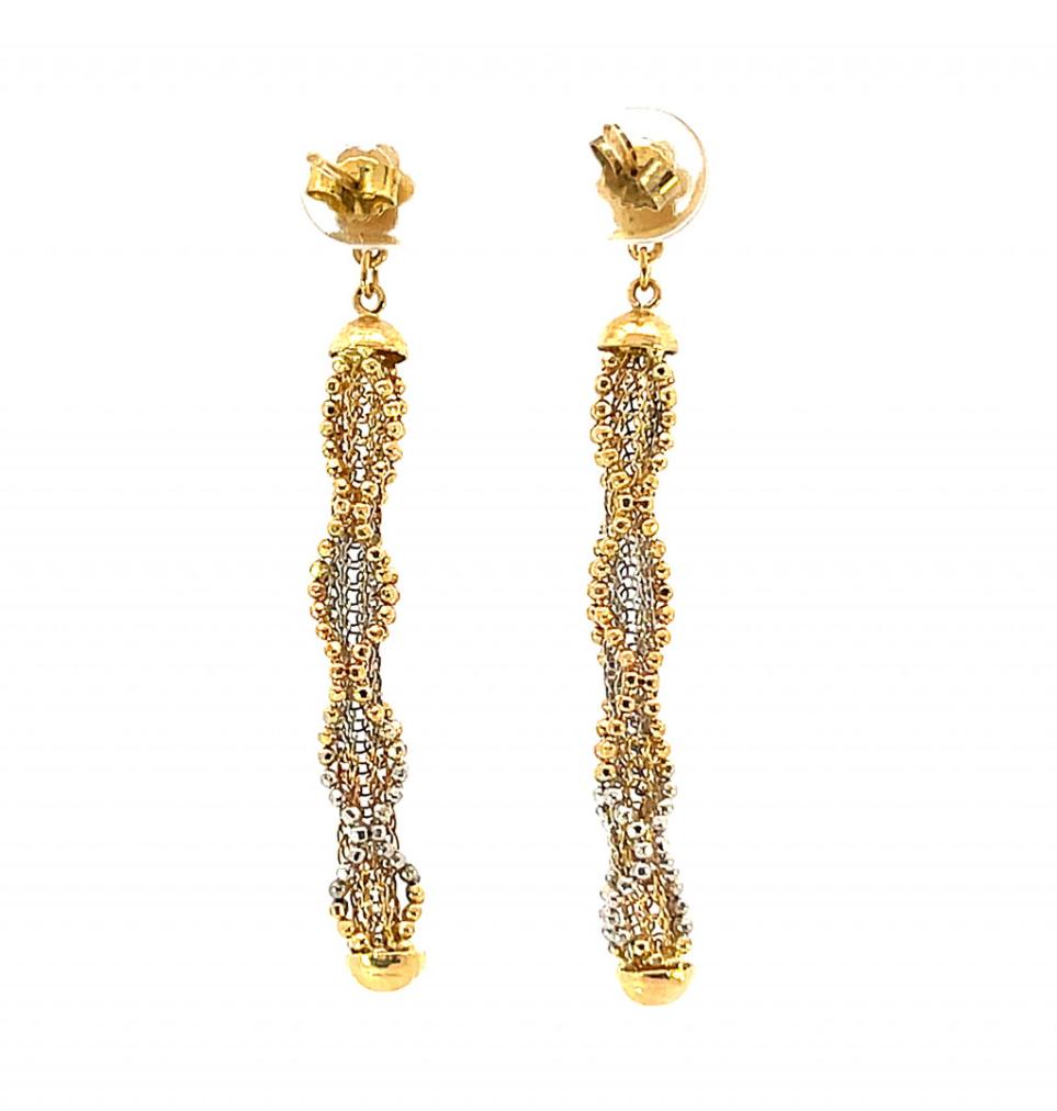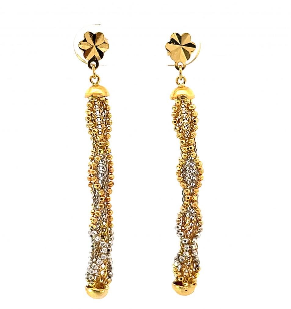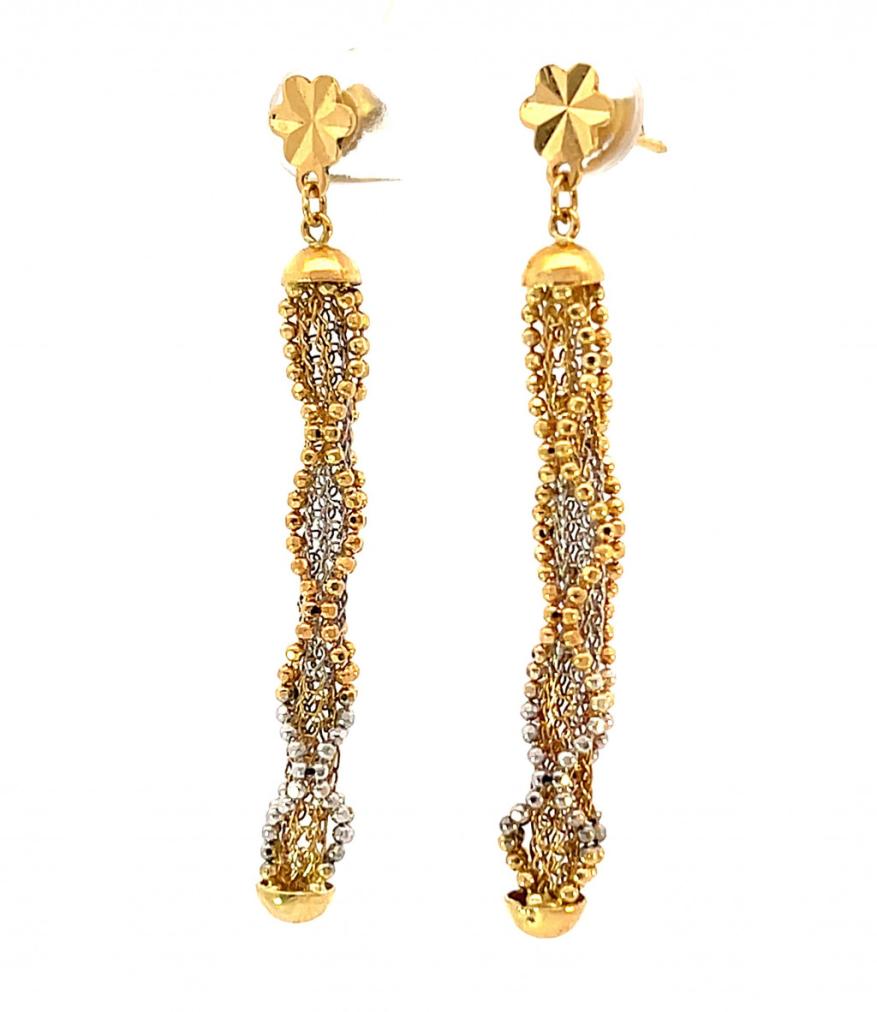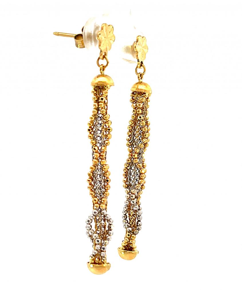 Originální zlaté náušnice v kombinaci žlutého a bílého zlata, visací, na puzetku. Zlato o ryzosti 750/1000 s puncem kohout. Puzety jsou z ryzosti 333/1000. Celková váha 4,65 g. Na délku měří 50 mm, v nejširším bodě měří 6 mm (kytička), šířka visací části je 5 mm.