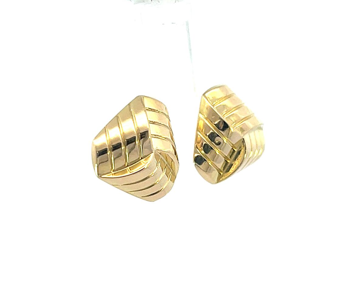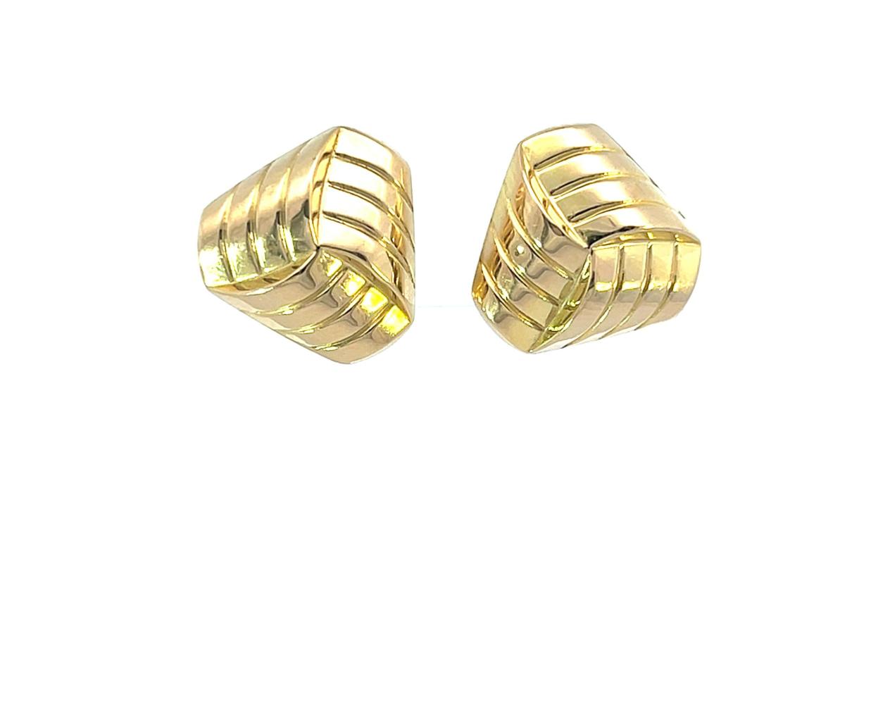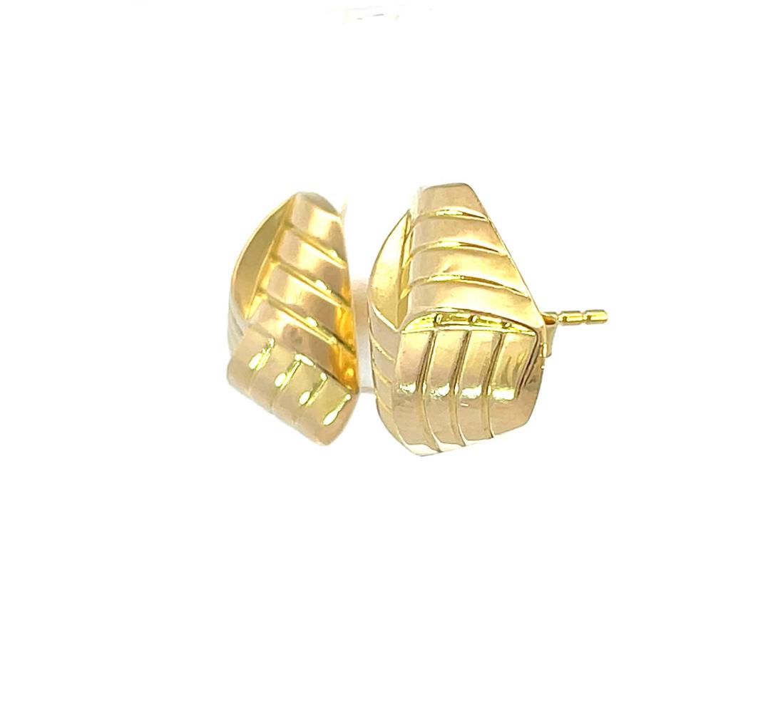 Zlaté náušnice o ryzosti 585/1000, punc labuť. Váha 2,16 g, rozměr ozdoby 14 x 15 mm. Jedna z náušnic má velmi drobnou prohlubeň ve tvaru tečky.