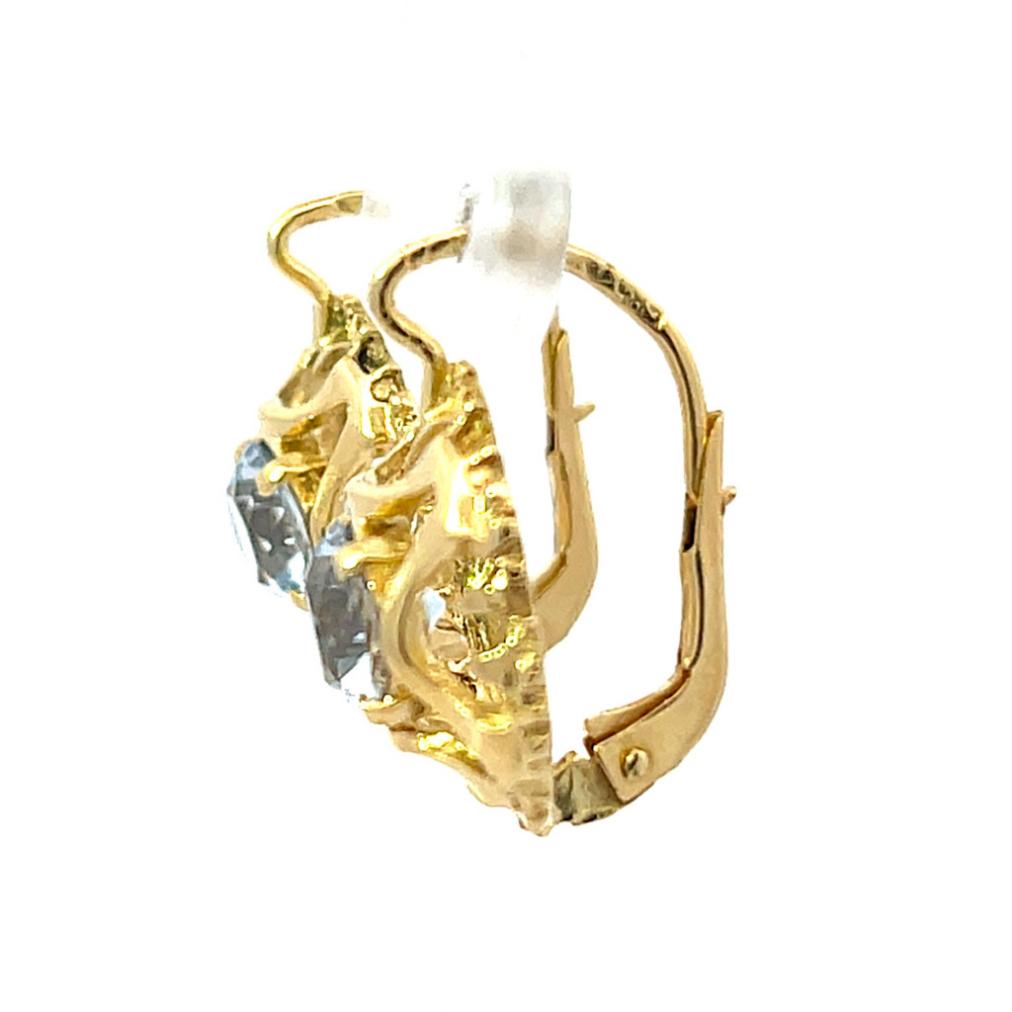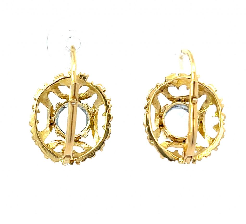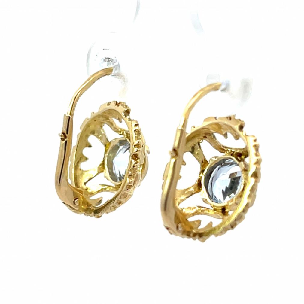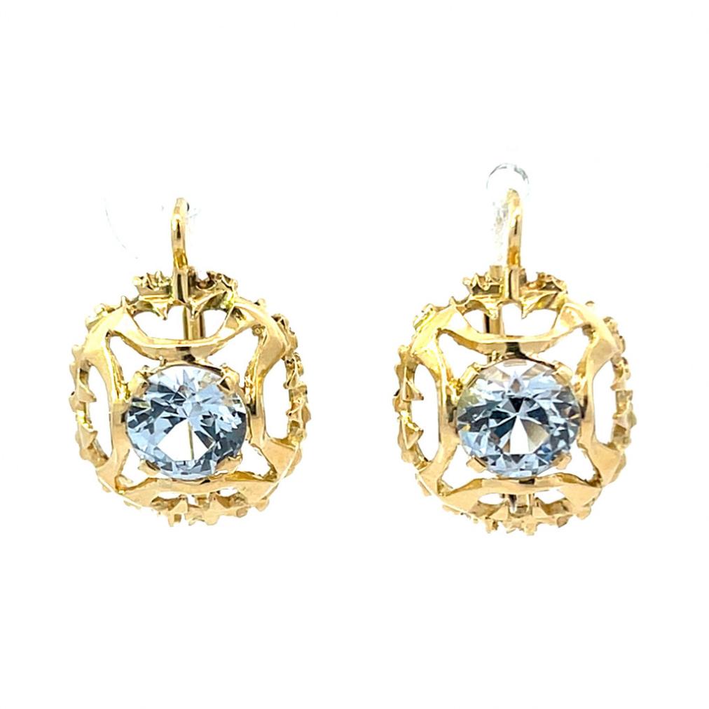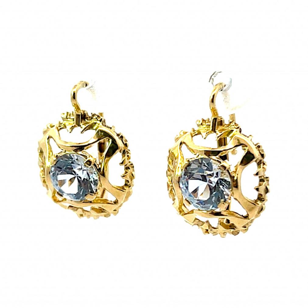 Zlaté náušnice o ryzosti 585/1000, punc čejka. Váha 3,45 g, výška 18 mm, průměr ozdoby 13 mm, průměr kamene 6 mm. Kameny jsou syntetické.