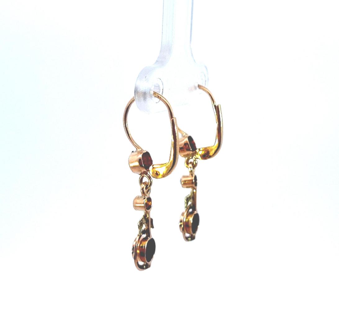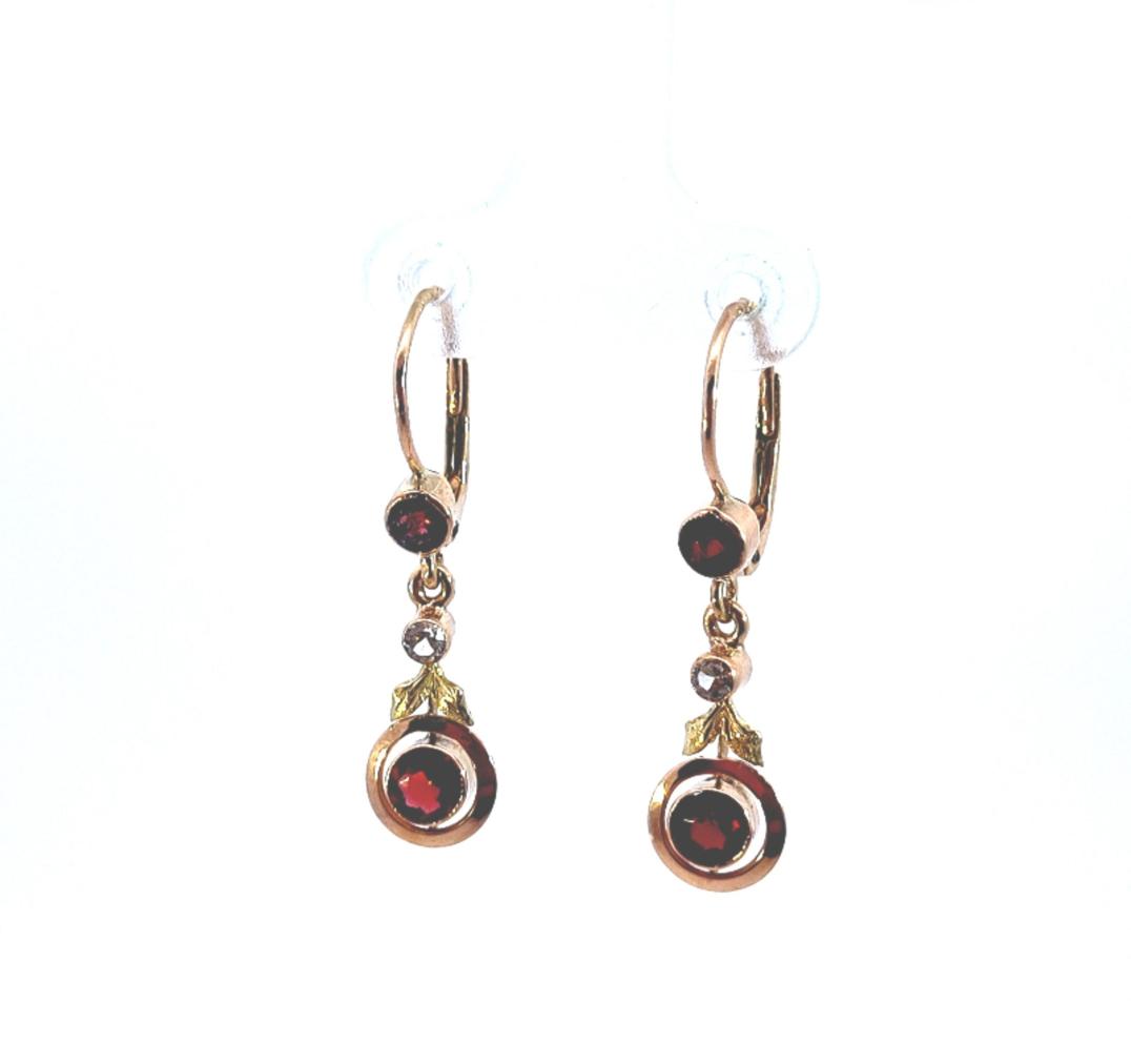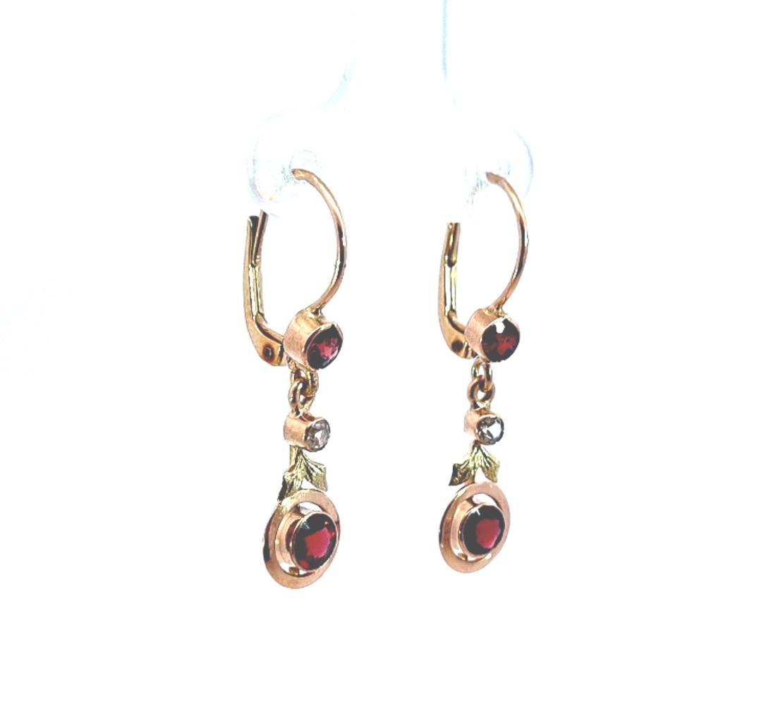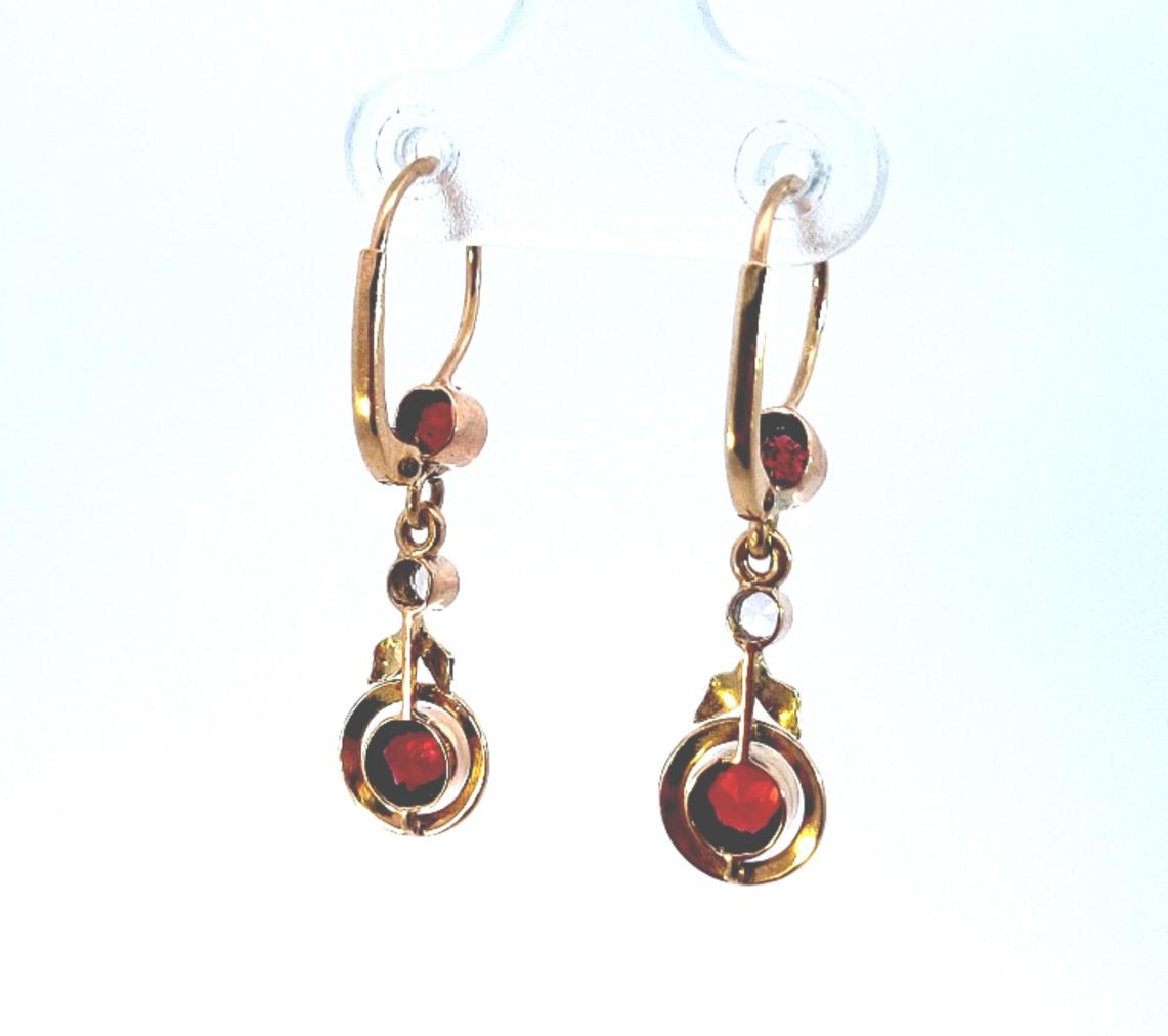 Zlaté visací náušnice zdobené tmavě červenými kameny a leukosafíry. Zlato o ryzosti 585/1000 s puncem labuť. Váha 1,96 g. Celková délka 30 mm, v nejširším bodě 7 mm. Průměr největšího kamene je 4 mm.